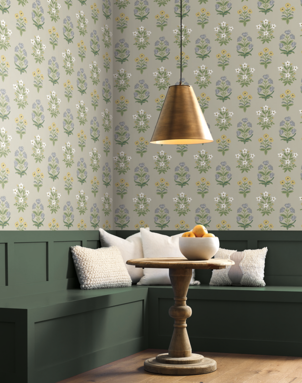 Delicate bouquets of block-print-inspired flowers are neatly arranged in a grid, for a print that is both organized and organic. This wallpaper is screen printed and comes in 27 inch rolls with a 25.25 inch repeat.