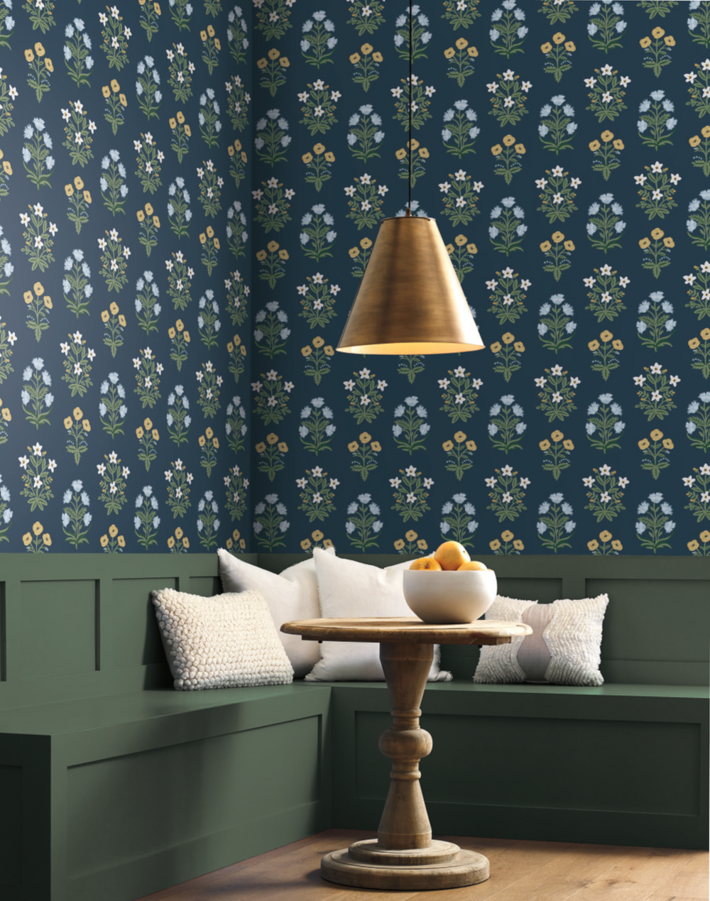 Delicate bouquets of block-print-inspired flowers are neatly arranged in a grid, for a print that is both organized and organic. This wallpaper is screen printed and comes in 27 inch rolls with a 25.25 inch repeat.