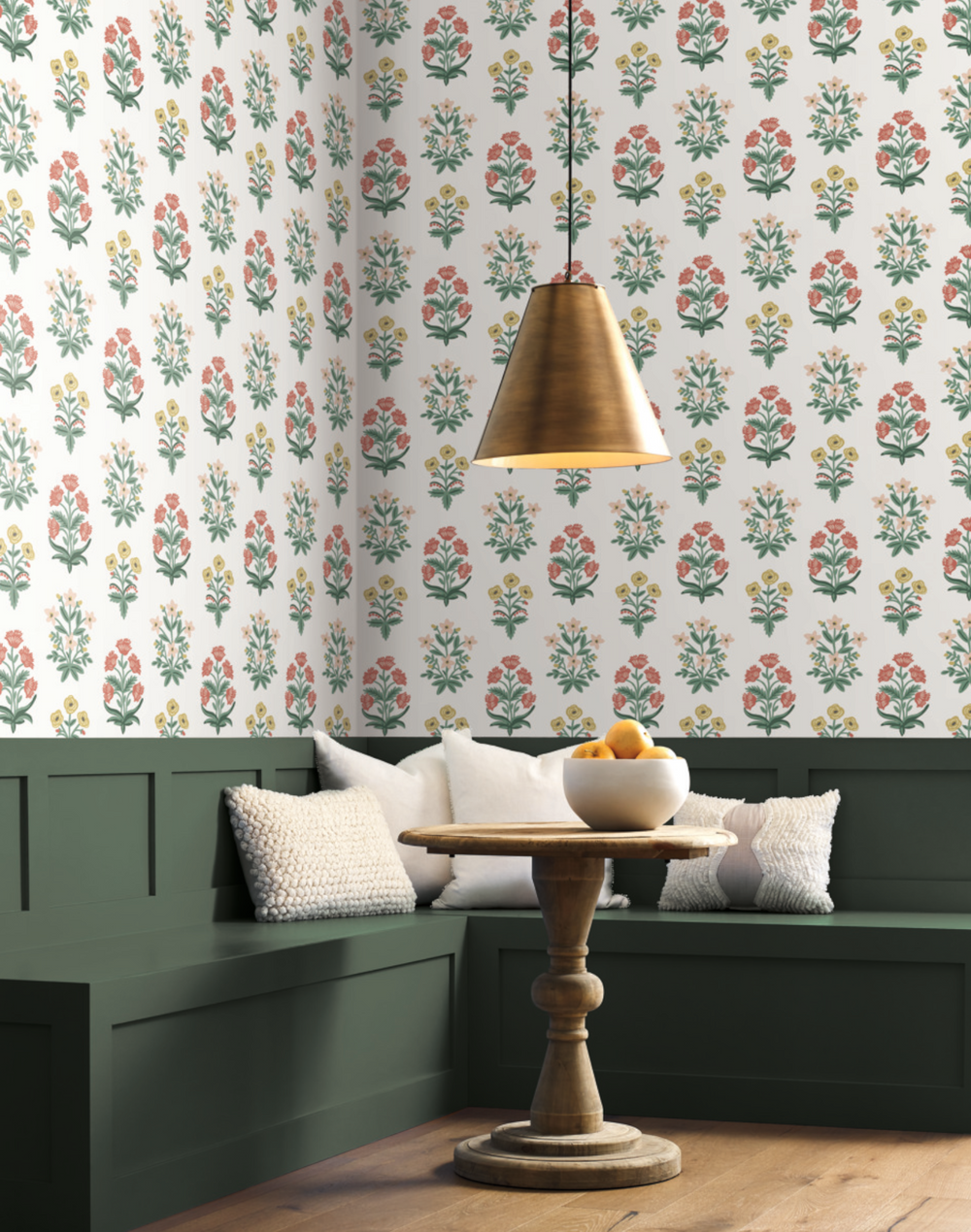 Delicate bouquets of block-print-inspired flowers are neatly arranged in a grid, for a print that is both organized and organic. This wallpaper is screen printed and comes in 27 inch rolls with a 25.25 inch repeat.