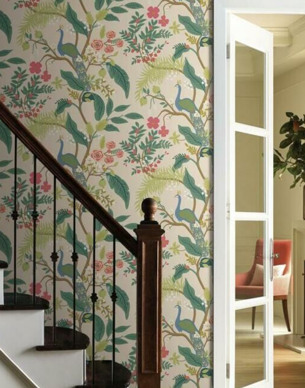 Magnificent peacocks perch on winding branches, surrounded by bright blooming flowers and emerald leaves. Inspired by traditional motifs, our modern take is both classic and playful. This wallpaper is screen printed and comes in 27 inch rolls with a 25.25 inch repeat.