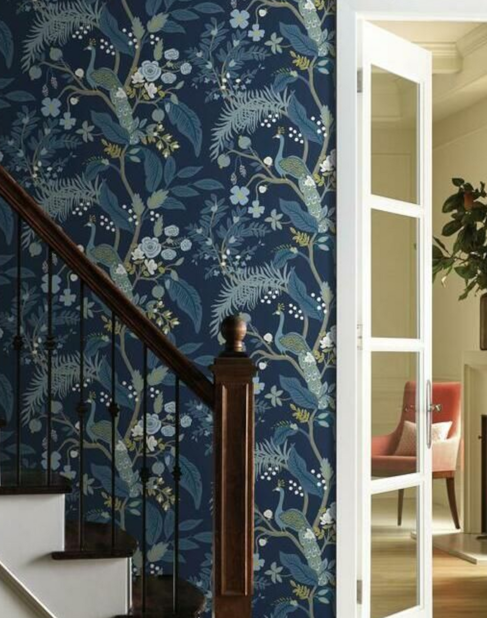 Magnificent peacocks perch on winding branches, surrounded by bright blooming flowers and emerald leaves. Inspired by traditional motifs, our modern take is both classic and playful. This wallpaper is screen printed and comes in 27 inch rolls with a 25.25 inch repeat.