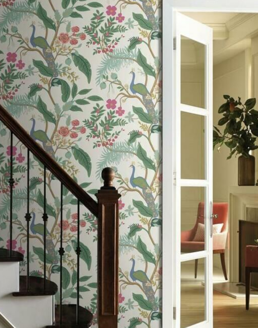 Magnificent peacocks perch on winding branches, surrounded by bright blooming flowers and emerald leaves. Inspired by traditional motifs, our modern take is both classic and playful. This wallpaper is screen printed and comes in 27 inch rolls with a 25.25 inch repeat.