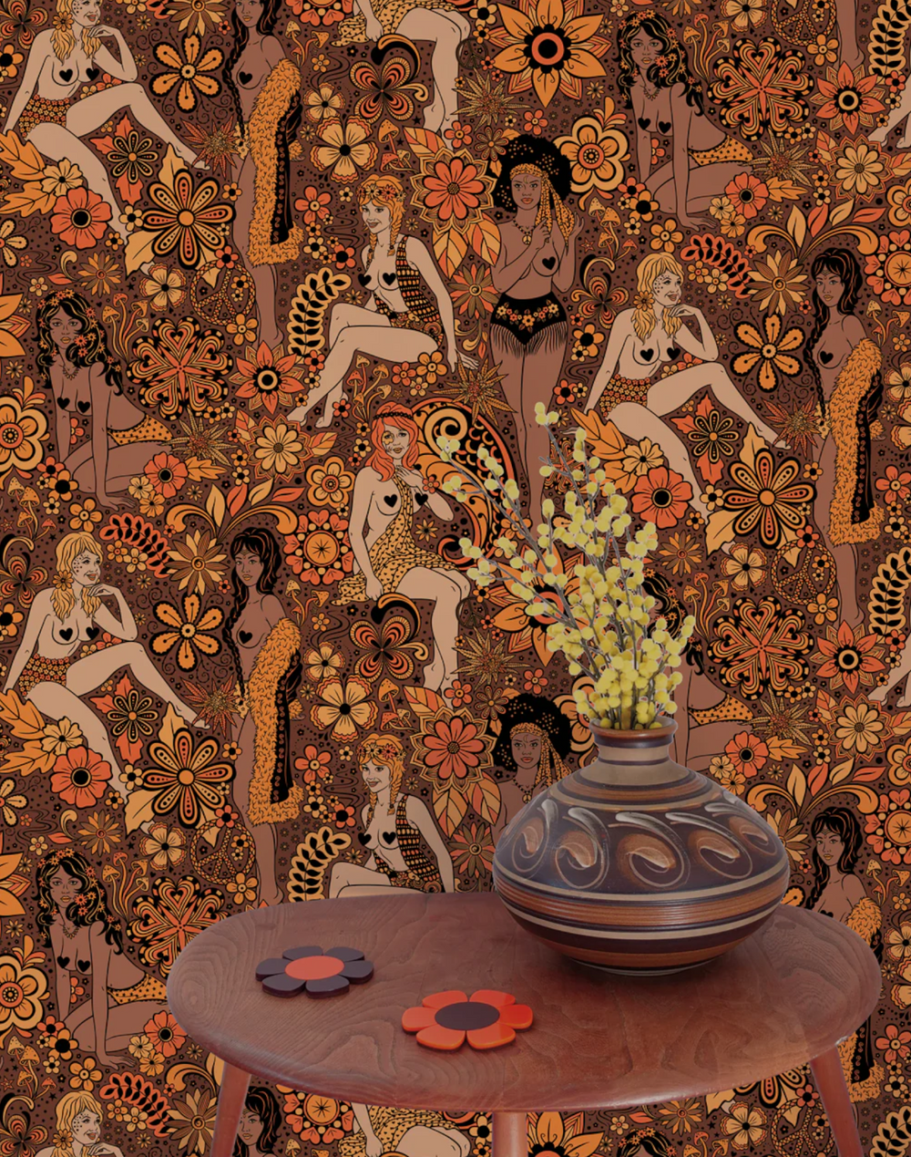 San Francisco, 1967: The Summer of Love! Dupenny's labyrinthine design reveals seductive "flower children" frolicking within a psychedelic botanical nirvana. This design was inspired by an original wallpaper from the 1960s and offers a novel twist on the kitsch Flower Power patterns of the past.