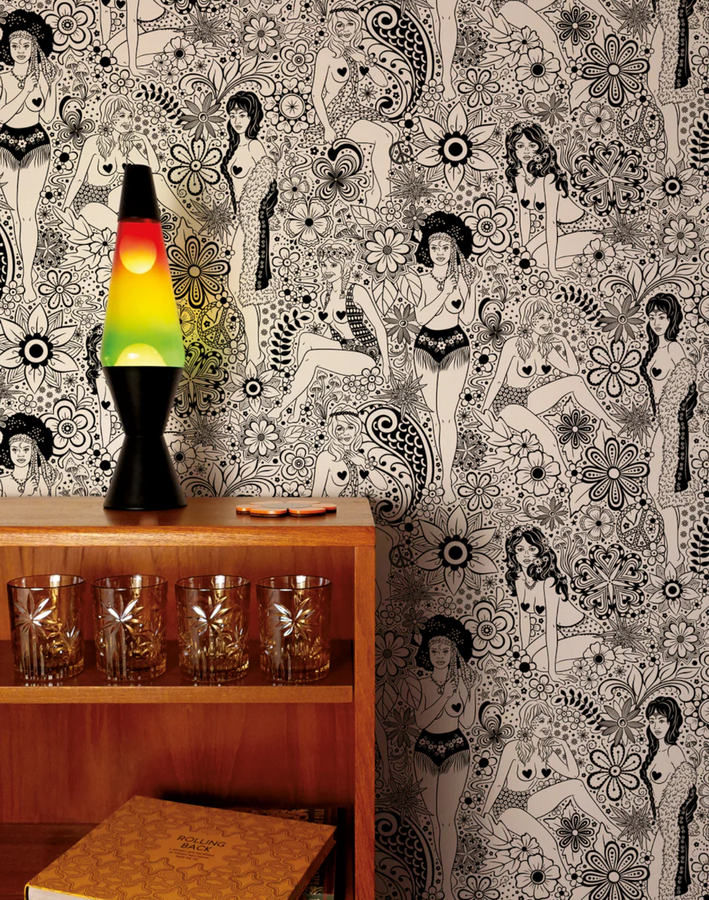 San Francisco, 1967: The Summer of Love! Dupenny's labyrinthine design reveals seductive "flower children" frolicking within a psychedelic botanical nirvana. This design was inspired by an original wallpaper from the 1960s and offers a novel twist on the kitsch Flower Power patterns of the past.
