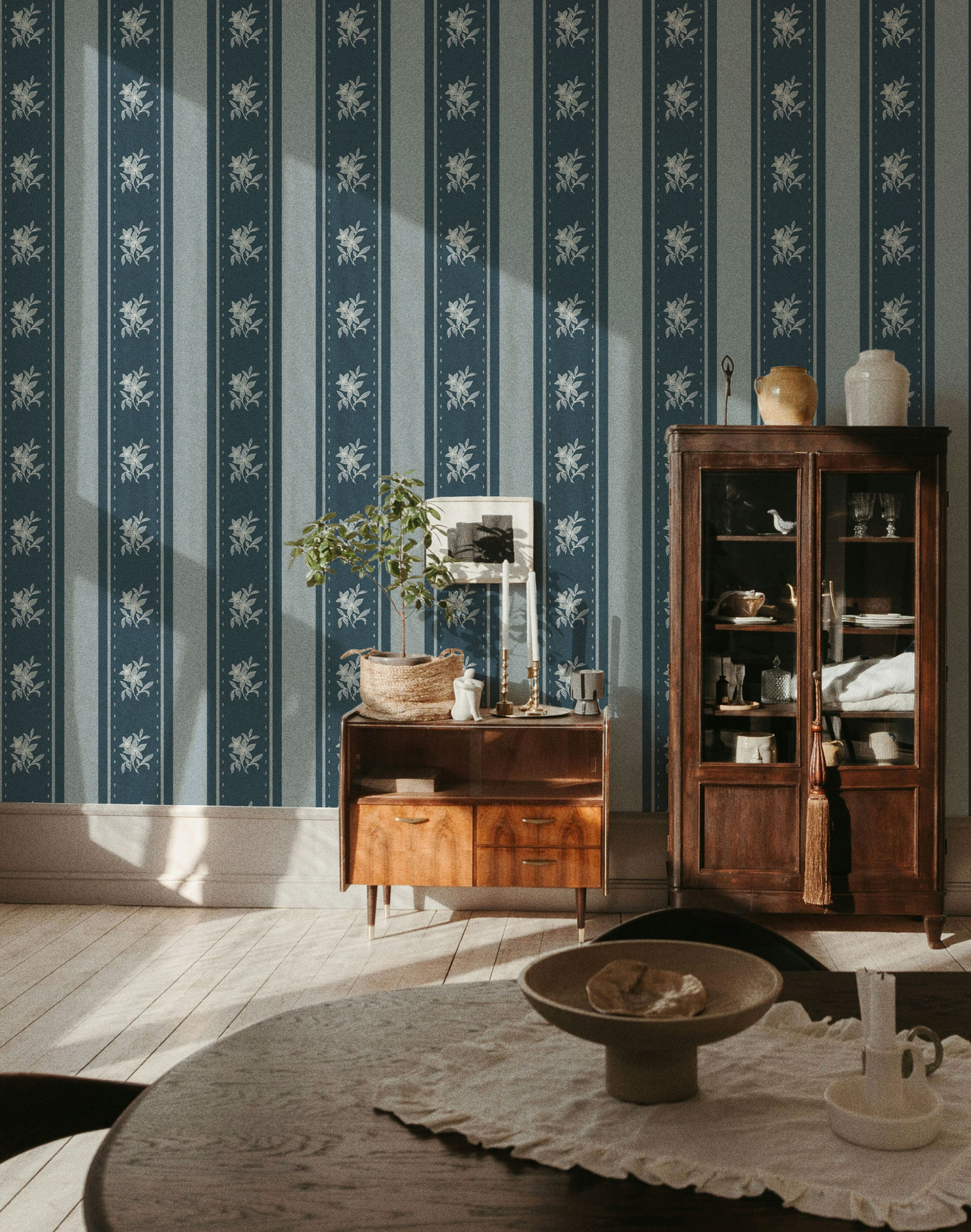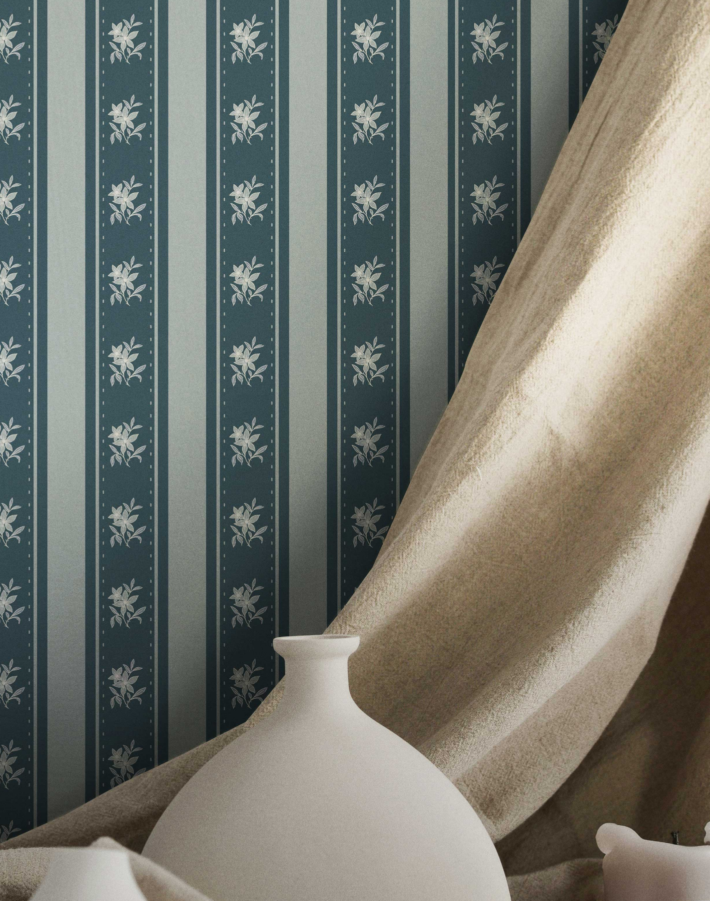 Glasshouse Stripe was inspired by 19th-century wallpaper patterns that paired soft floral motifs with structured vertical stripes. Commonly found in parlors and hallways from the 1830s to the 1890s, these designs brought a sense of rhythm and height to the walls of Victorian homes, and now they can do the same for your interior spaces as well.