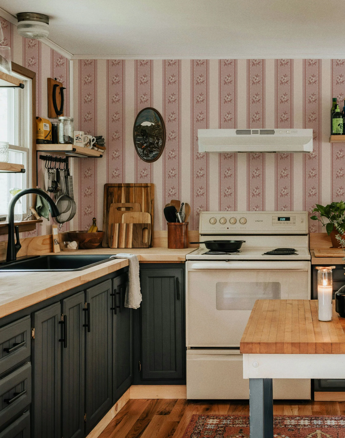 Glasshouse Stripe was inspired by 19th-century wallpaper patterns that paired soft floral motifs with structured vertical stripes. Commonly found in parlors and hallways from the 1830s to the 1890s, these designs brought a sense of rhythm and height to the walls of Victorian homes, and now they can do the same for your interior spaces as well.