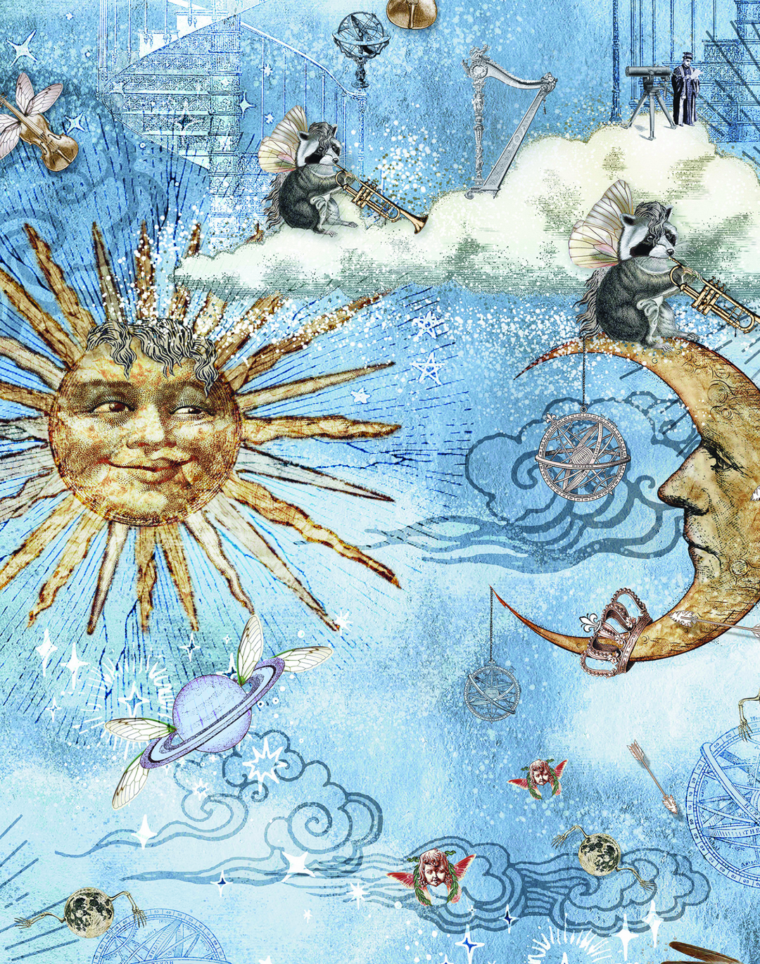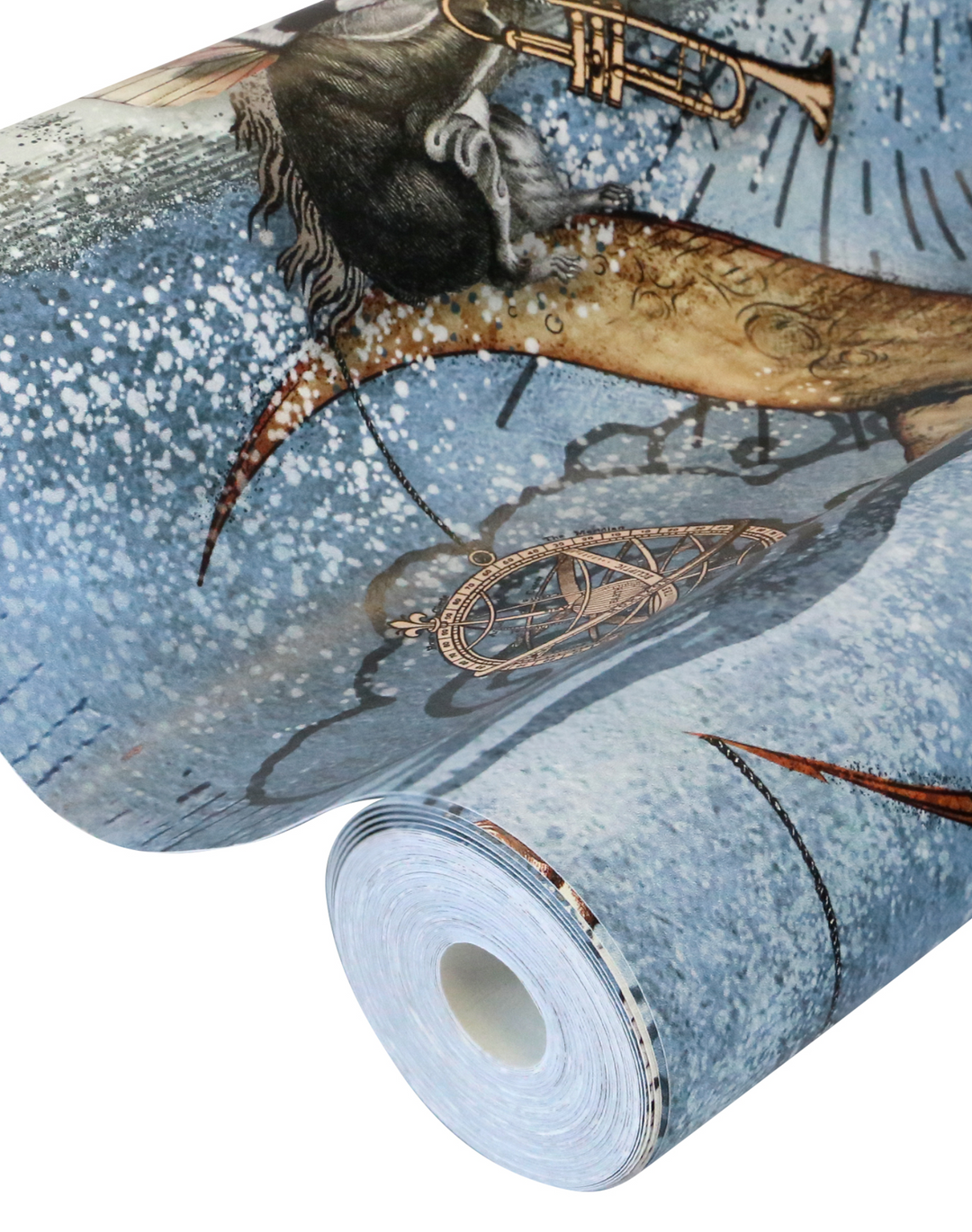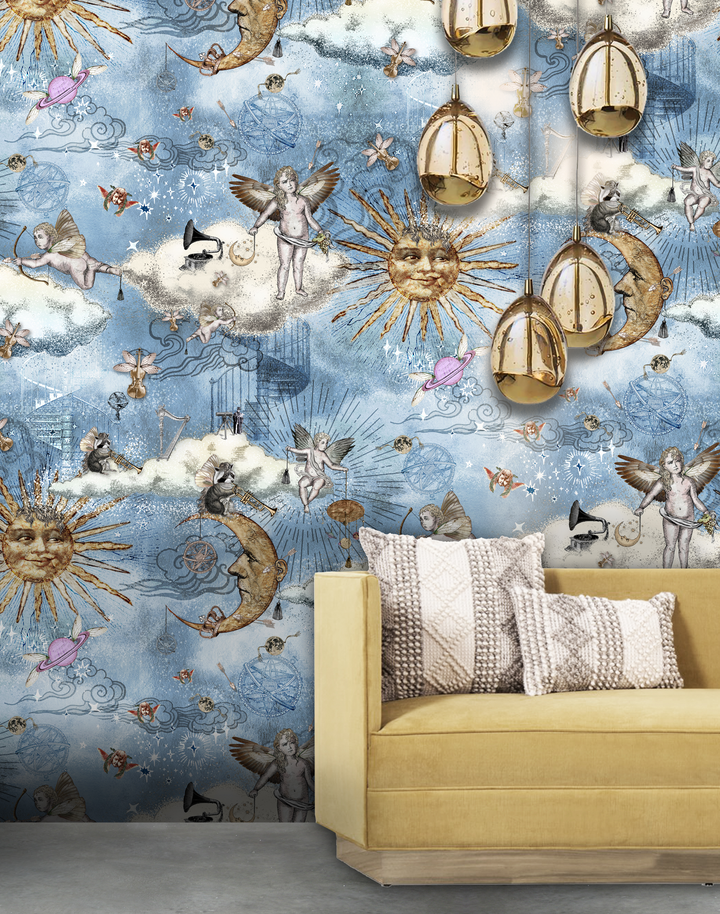 Be taken to cloud 9 with this dreamy wallpaper print. Cupid and his ensemble of cherubs will whisk you off your feet to dance with the sun and the moon. Waltz your way around dreamland while the illusory orchestra strike up the band. Don’t forget to climb the spiral stairway to heaven, which you can find hidden in the shadowy black background, only to be seen when the clouds part ways. A truly imaginative wallpaper which will transport your room far, far away.