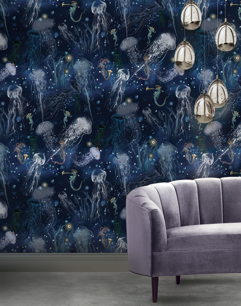 Jellyfish await you in this underwater world. In between the skeletal seahorses and sly seaweed you’ll see the spying eyes of sea urchins waiting until it’s safe to play. The luminescent glow of the jellyfish create a mysterious radiance against the shadowy coral background, allowing your eye to see into the darkest depths of the sea. A closer look highlights the copper trumpets and horns playing along to a Sirens song. Be careful not to get lost at sea…