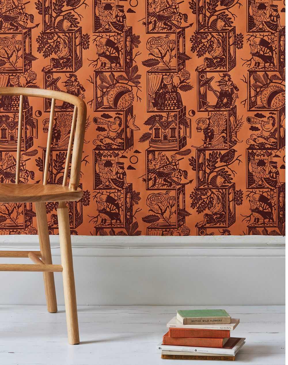 This design originates from original lino-cut elements by Christopher Brown and as with many St. Jude’s designs the texture of these hand printed elements may well be reflected in this wallpaper.