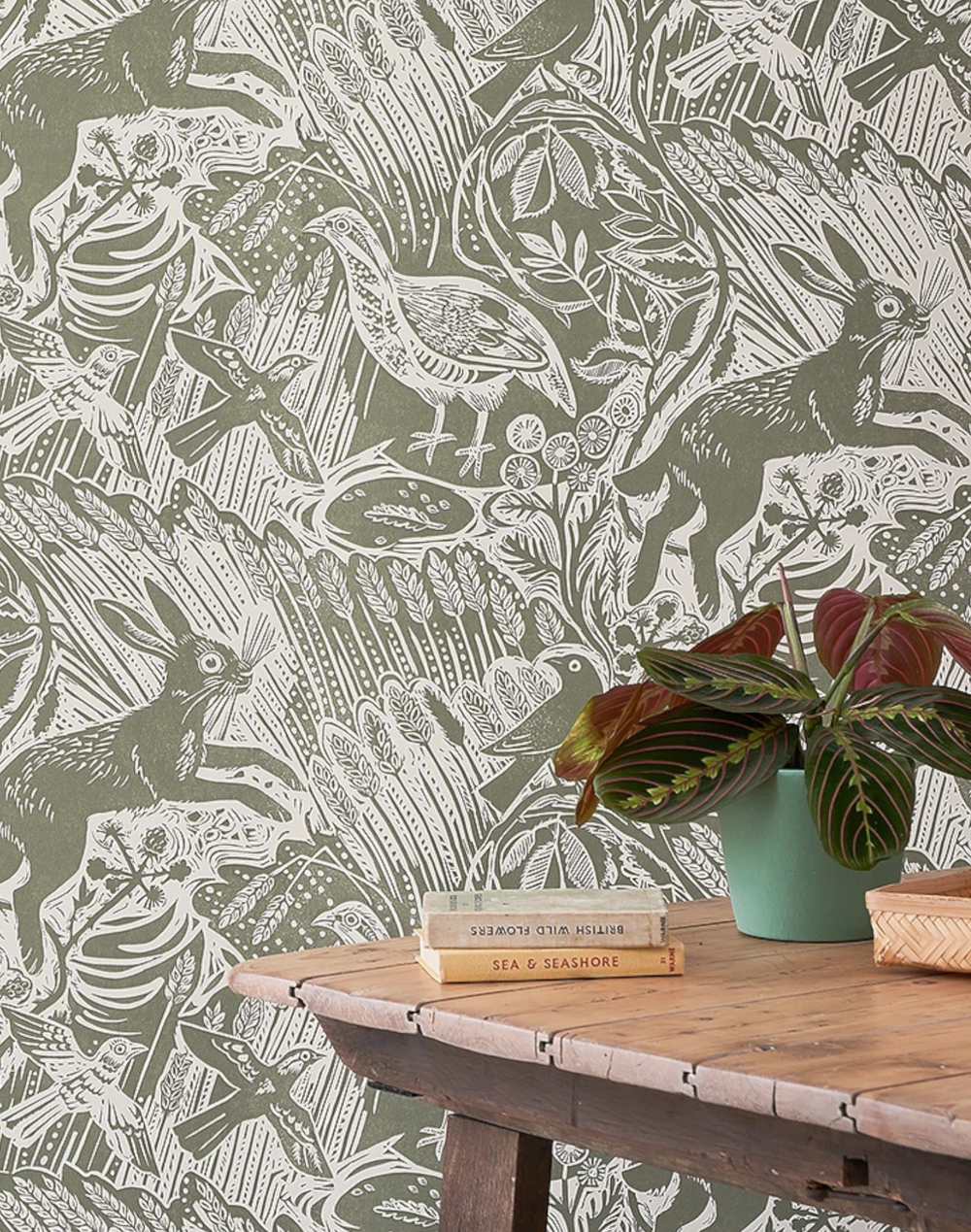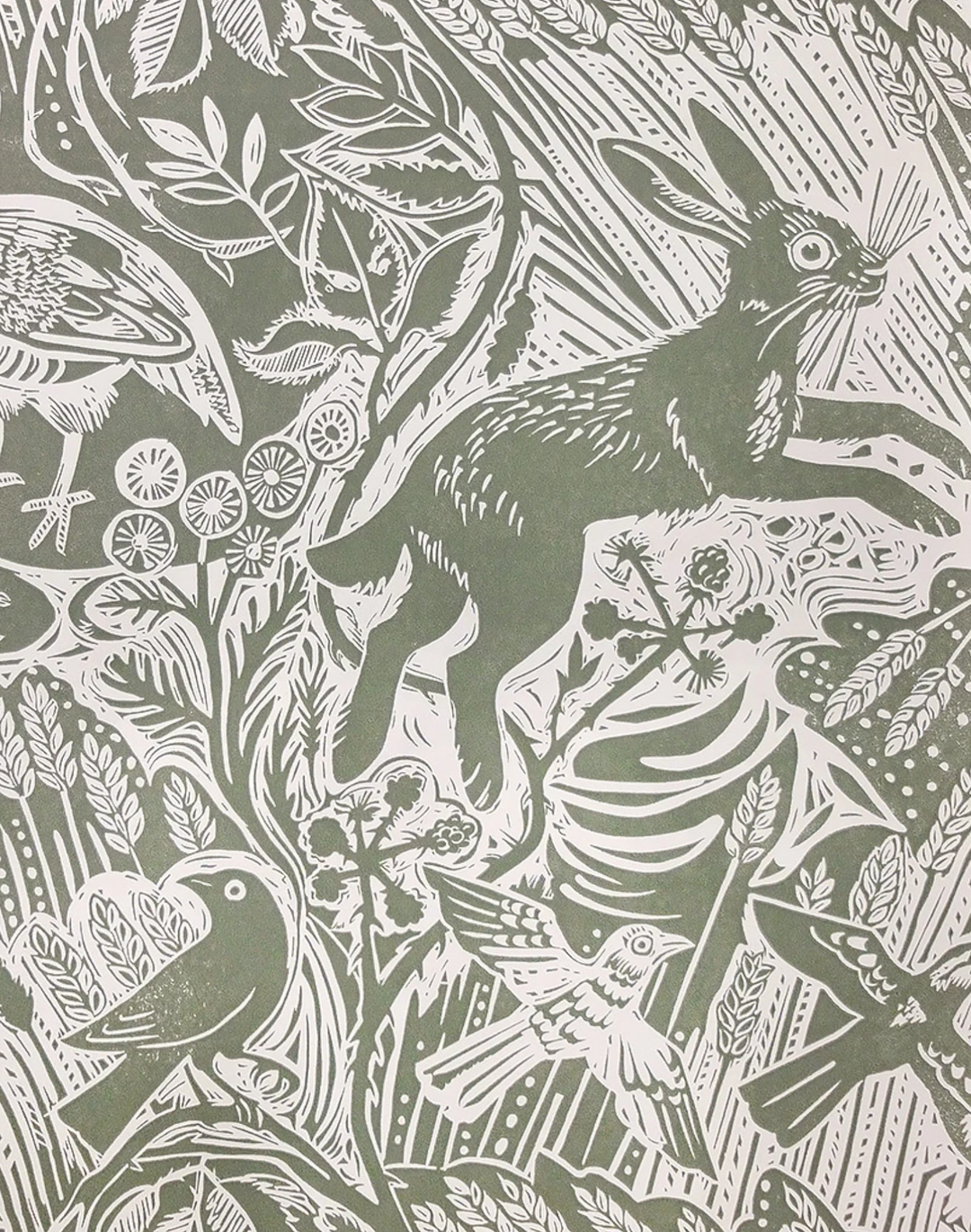 Harvest Hare by Mark Hearld is a single color wallpaper, printed in the UK using water-based inks and paper from sustained forests. This design originates from an original lino-cut by Mark Hearld and as with many St. Jude’s designs the texture of these hand printed elements may well be reflected in this wallpaper.