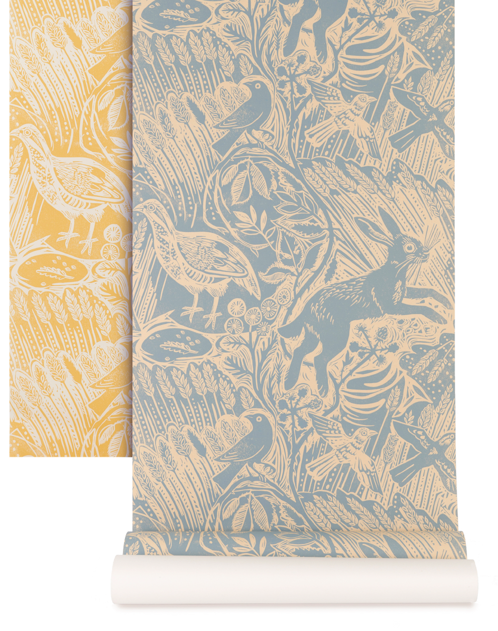 Harvest Hare by Mark Hearld is a single color wallpaper, printed in the UK using water-based inks and paper from sustained forests. This design originates from an original lino-cut by Mark Hearld and as with many St. Jude’s designs the texture of these hand printed elements may well be reflected in this wallpaper.