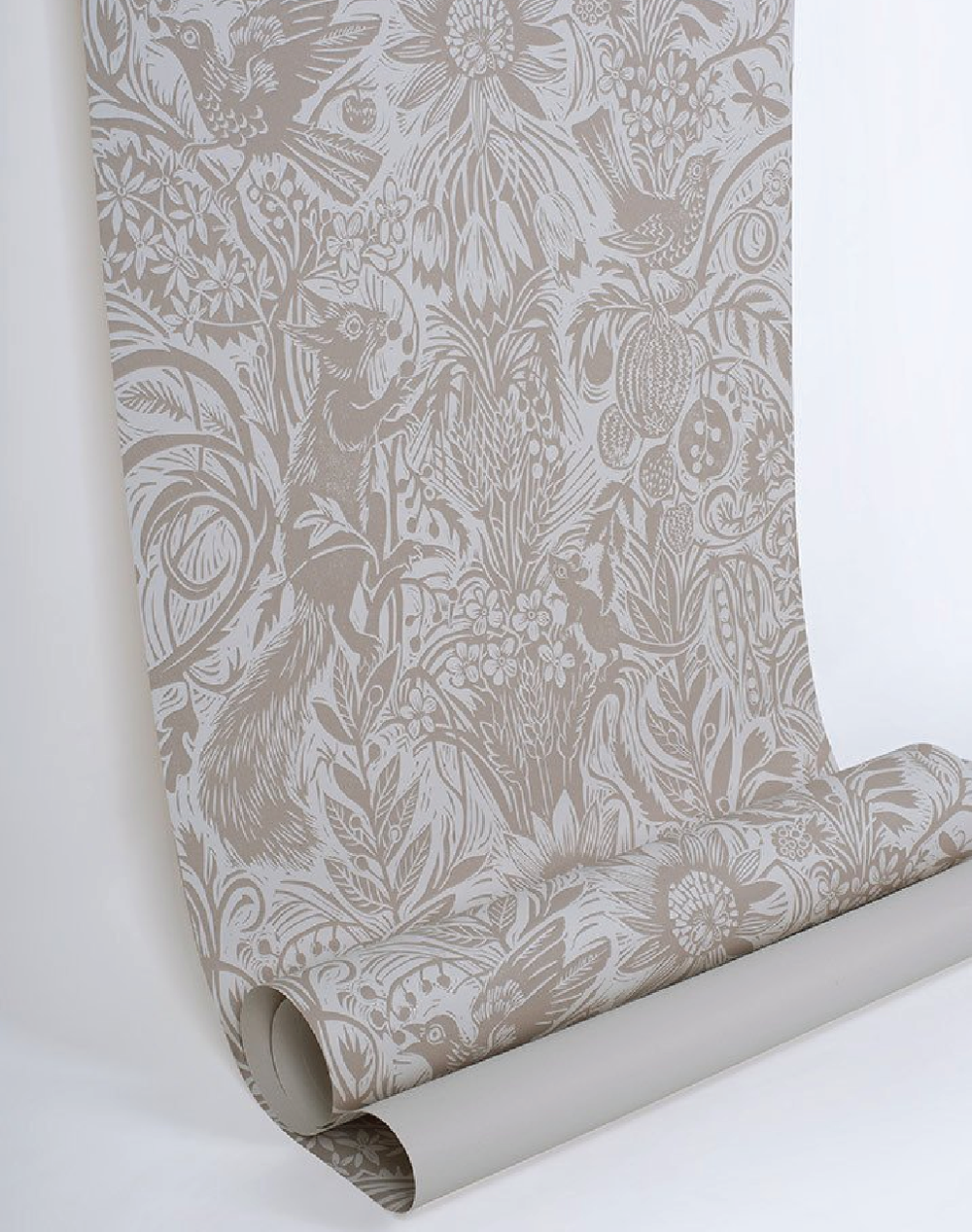 Squirrel and Sunflower by Mark Hearld is a single color wallpaper, printed in the UK using water-based inks and paper from sustained forests. This design originates from an original lino-cut by Mark Hearld and as with many St. Jude’s designs the texture of these hand printed elements may well be reflected in this wallpaper.