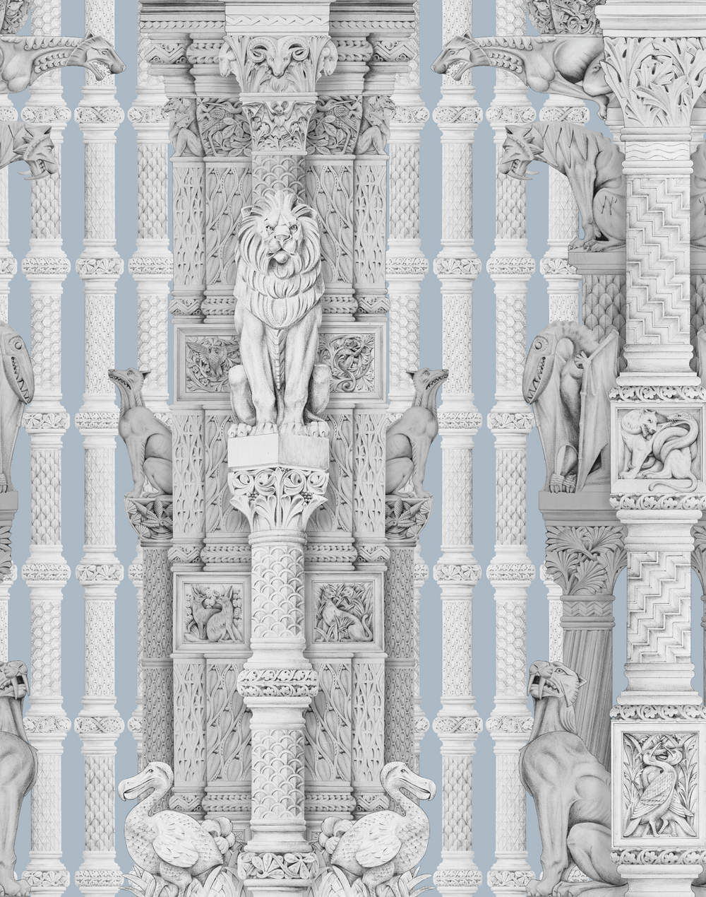 Hierarchy celebrates the intricately carved stonework that adorns the exterior of London’s Natural History Museum to create a striking wallcovering full of architectural splendor as well as the incredible natural world. The gargoyles featured here are not grotesque or of mythological form, but rather intricately carved animals, with a proud lion taking center stage.
