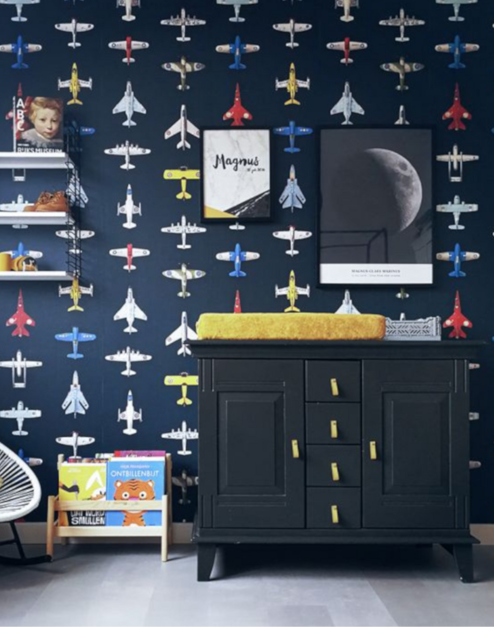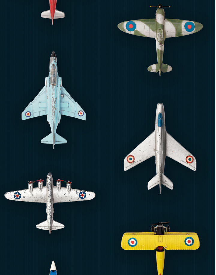 Studio Ditte wallpaper with a sky full of vintage toy airplanes on a dark blue background. Cool wallpaper for the room of young adventurers. Your child boards an exciting flight to unknown destinations.