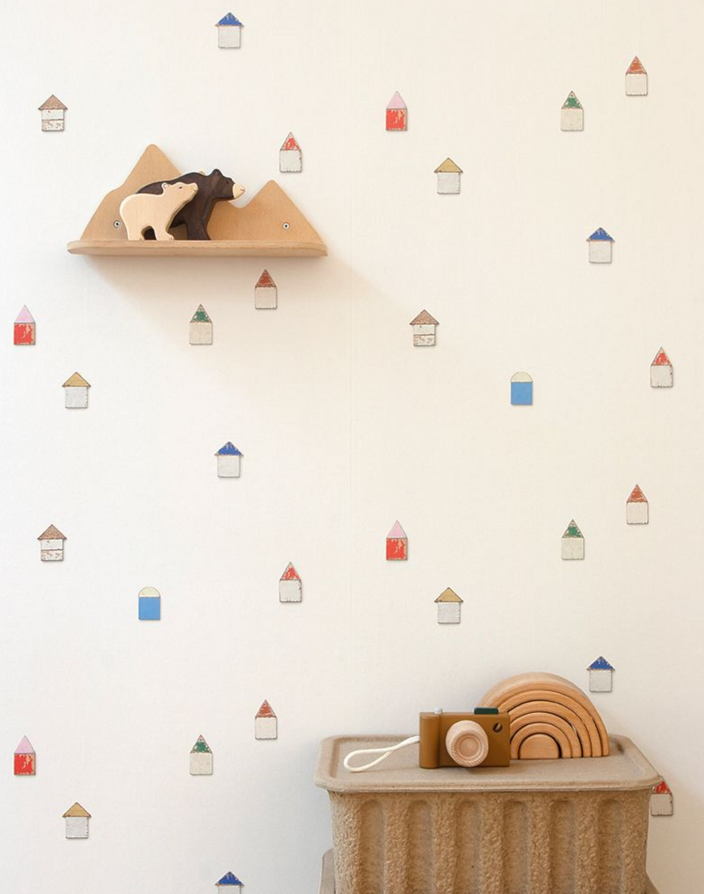 Studio Ditte beach houses wallpaper with beautiful weathered wooden houses in cheerful colors on a cream-colored background. The houses with their charming, nostalgic appearance are reminiscent of sunny days at the seaside. Bring a warm summer atmosphere and tranquility into your room with the beach houses wallpaper.