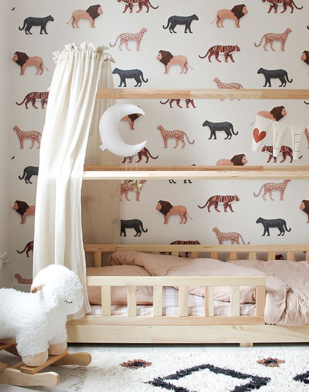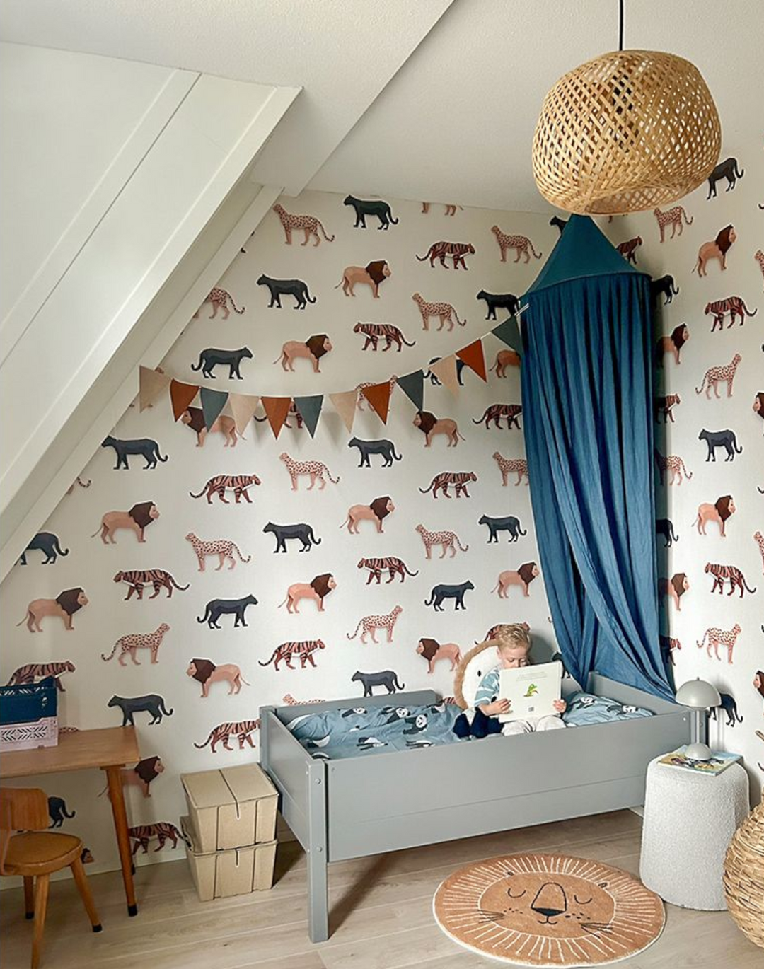 Studio Ditte Big Cats wallpaper. Wallpaper for children who love powerful wild cats such as tigers, lions, cheetahs and black panthers. These big cats with majestic beauty are handmade from paper and give the wallpaper a beautiful subtle 3D effect. The wild animals together form a beautiful neutral color palette on a cream-colored background. Perfect wallpaper for an animal lover's nursery.