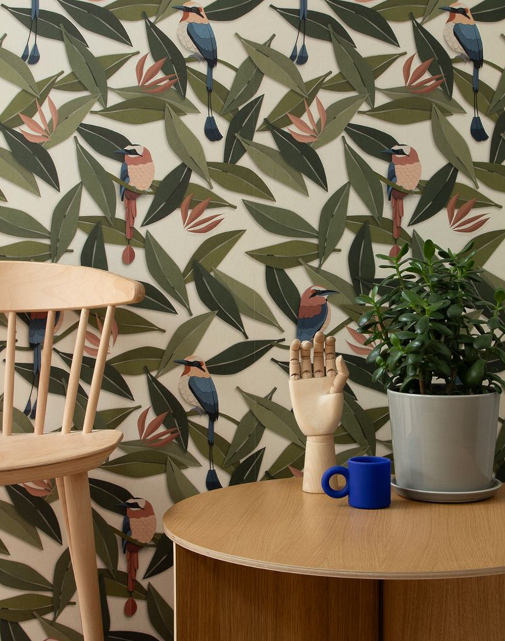 Wallpaper with elegant birds hidden among leaves and elegant flowers.