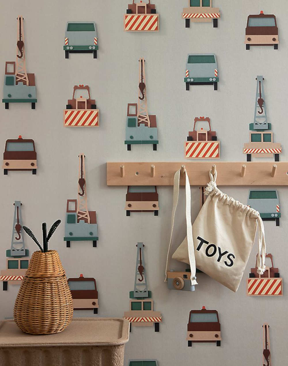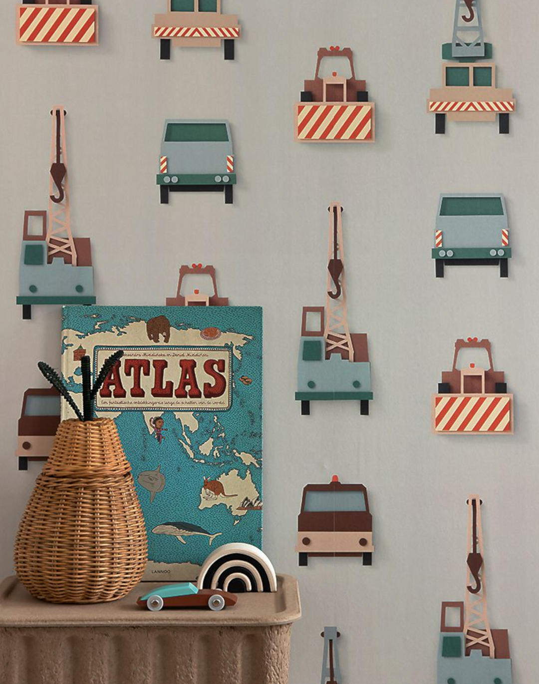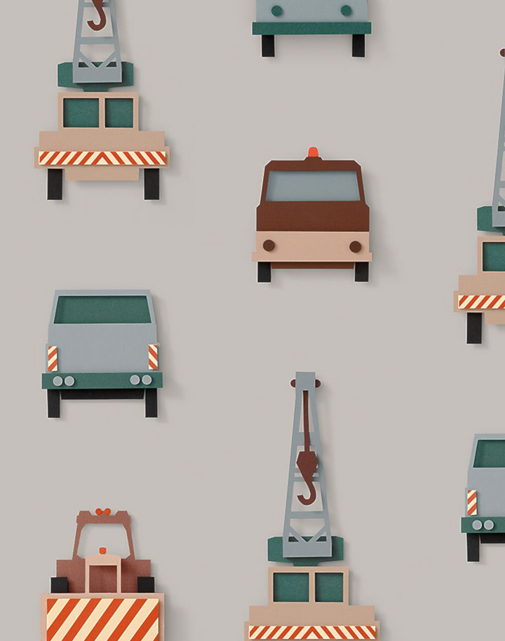 Studio Ditte crane truck wallpaper with a light grey background. Wallpaper for children who love cool work cars, shovels and crane trucks. The cars are handmade from paper and give the wallpaper a nice subtle 3D effect. Perfect children's wallpaper for fans of cool construction cars.