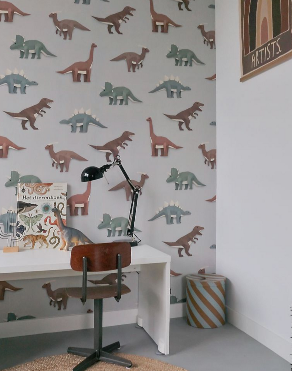 Studio Ditte dinosaur wallpaper. Wallpaper for kids who love the Tyrannosaurus rex, Triceratops or Brachiosaurus. The dinosaurs are handmade from paper and give the wallpaper a nice subtle 3D effect. Together the dinosaurs form a beautiful color palette on a light grey background. Perfect wallpaper for a dino lover's children's room.