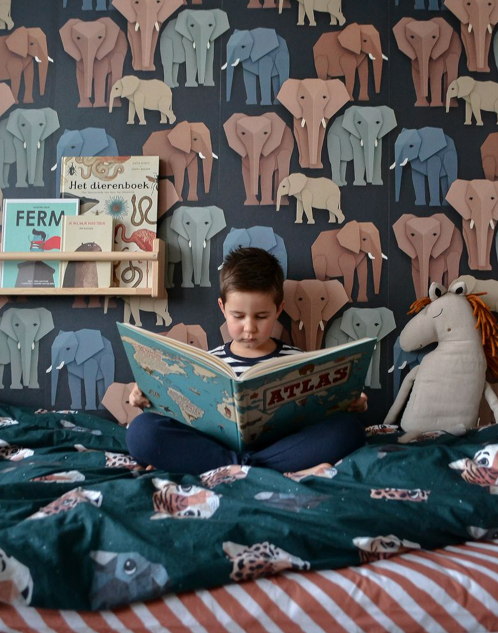 Studio Ditte wallpaper with wise elephants. Together the elephants form a beautiful color palette on a dark blue background. Perfect wallpaper for an animal lover.
