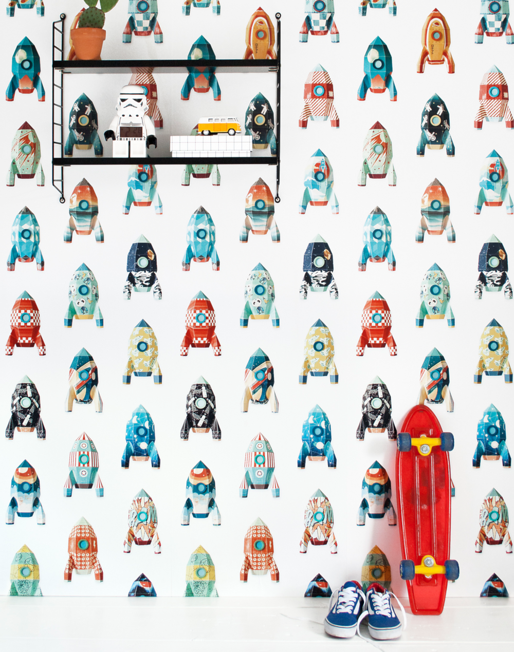 Studio Ditte kids wallpaper with rockets for all aspiring astronauts! Take an adventurous space journey to the infinite universe with this old school rockets. In the colorful rocket wallpaper for the nursery, your child will discover new details every time.