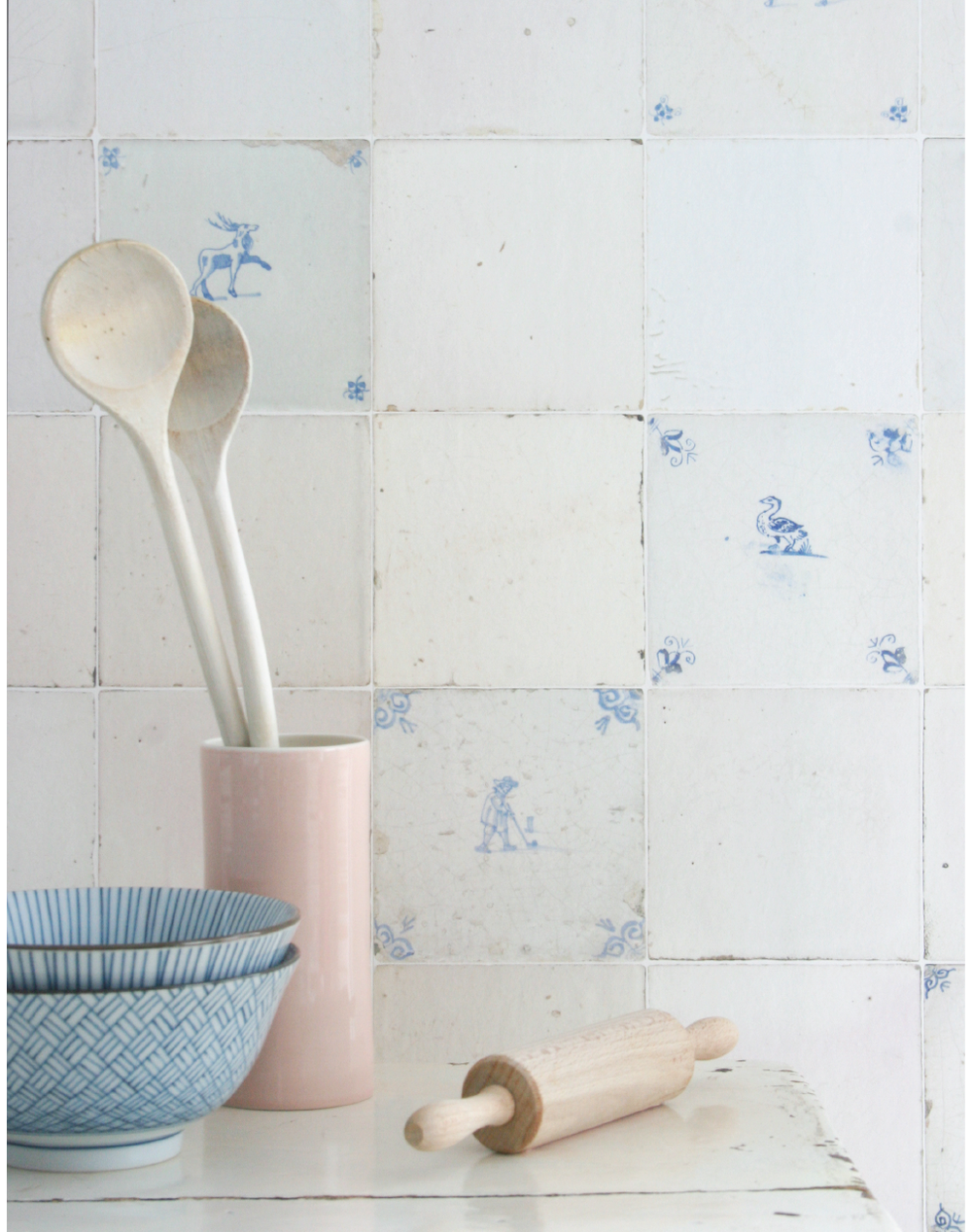 The tiles wallpaper provides a beautifully light decoration of antique tiles for your wall. It is a balanced mix of worn white Frisian tiles and old Dutch blue tiles. Picturesque farmer landscapes, children’s games, birds and farm animals spark your imagination. The wallpaper brings a touch of the 17th century back in the interior.