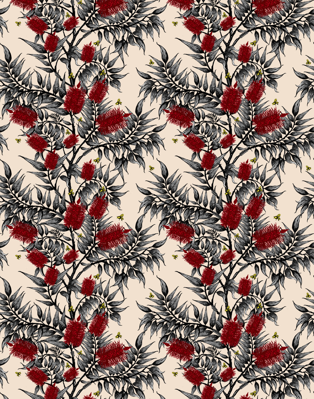 Our beautiful wallpaper is printed in Australia using our striking contemporary hand-drawn designs. Our most iconic design features the Callistemon species or more commonly referred to as bottlebrush because of their cylindrical brush like flowers resembling a traditional bottle brush. the plants are found in the more temperate regions of Australia.