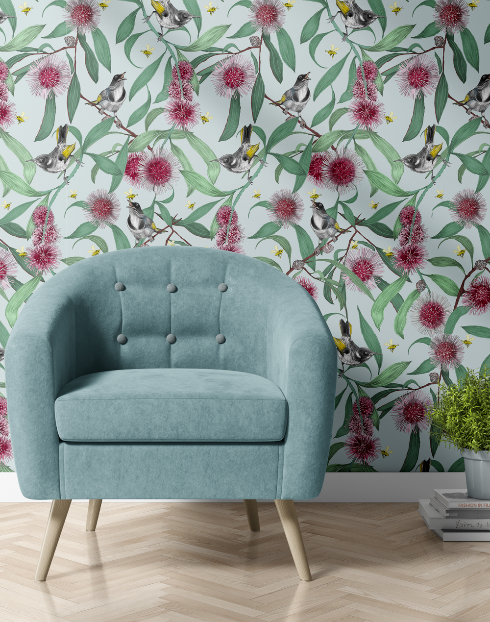Our beautiful wallpaper is printed in Australia using our striking contemporary hand-drawn designs. This featured design is inspired by the beautiful Hakea Laurina. Hakea laurina is shrub or small tree commonly known as kodjet or pin-cushion hakea and is endemic to Western Australia. The Noongar name for the plant is kodjet or kojet. It has red and cream conspicuous globular flowers and lance shaped leaves.