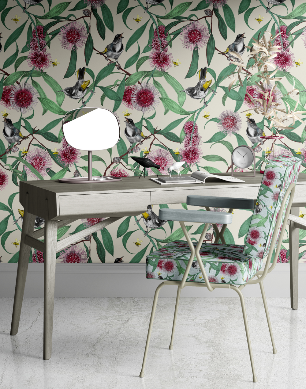Our beautiful wallpaper is printed in Australia using our striking contemporary hand-drawn designs. This featured design is inspired by the beautiful Hakea Laurina. Hakea laurina is shrub or small tree commonly known as kodjet or pin-cushion hakea and is endemic to Western Australia. The Noongar name for the plant is kodjet or kojet. It has red and cream conspicuous globular flowers and lance shaped leaves.