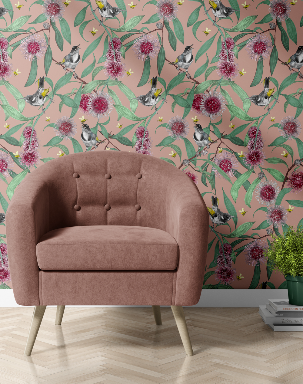 Our beautiful wallpaper is printed in Australia using our striking contemporary hand-drawn designs. This featured design is inspired by the beautiful Hakea Laurina. Hakea laurina is shrub or small tree commonly known as kodjet or pin-cushion hakea and is endemic to Western Australia. The Noongar name for the plant is kodjet or kojet. It has red and cream conspicuous globular flowers and lance shaped leaves.