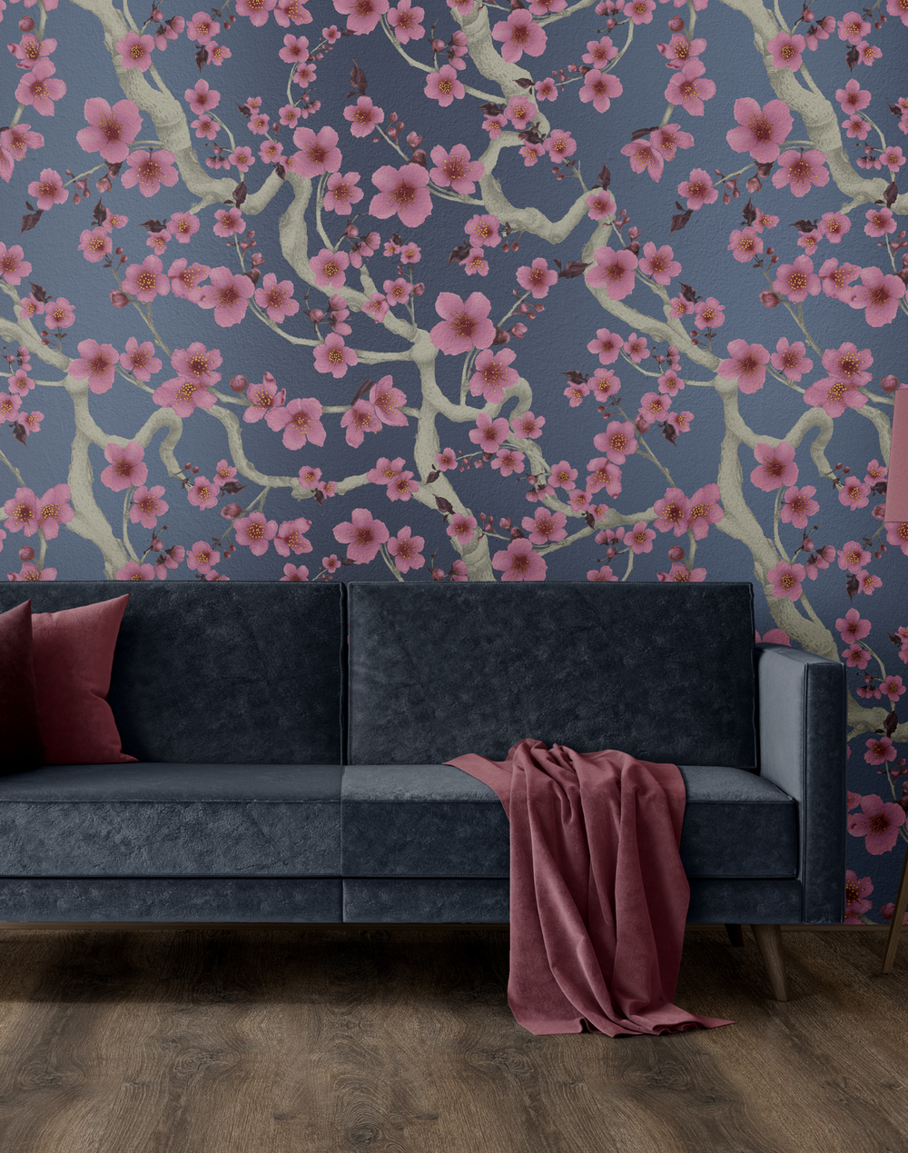 Cherry Blossom Floraison, Pink on Smokey Blue