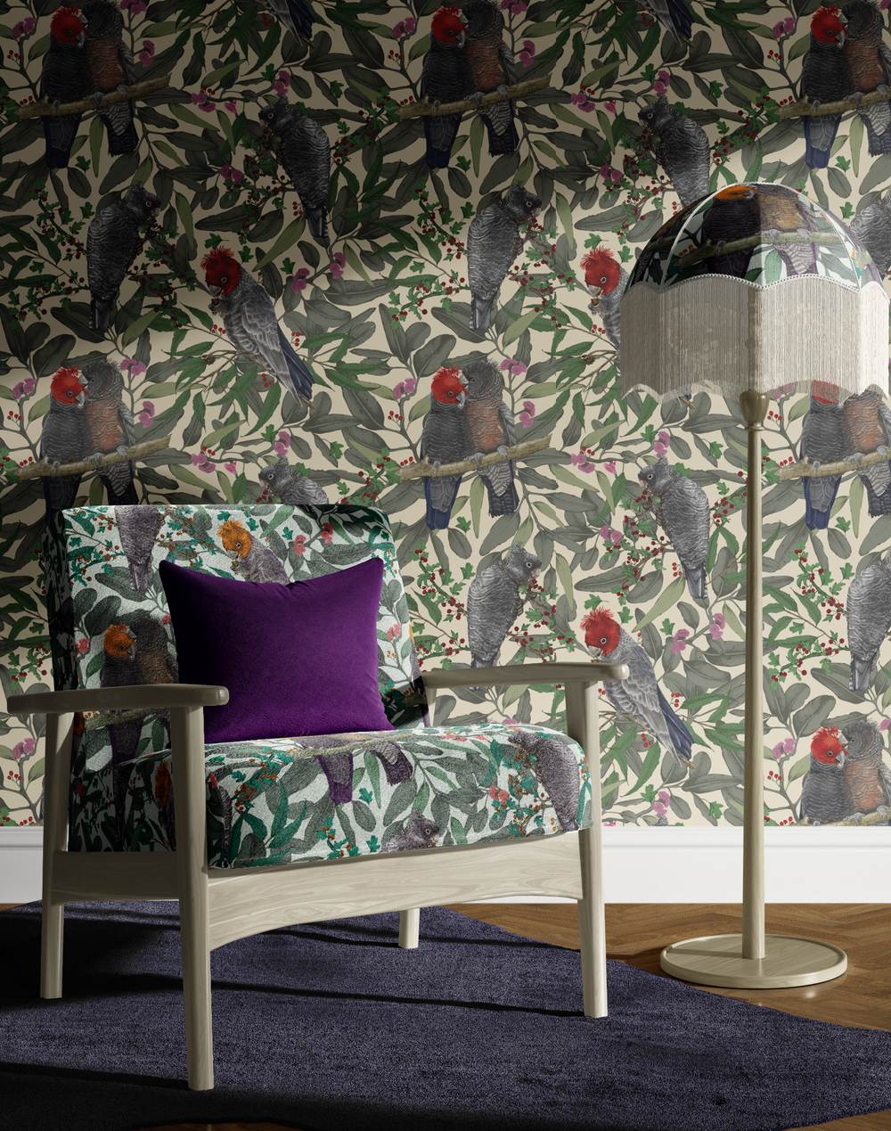 Our beautiful wallpaper is printed in Australia using our striking contemporary hand-drawn designs. This featured design is inspired by the Gang Gang Cockatoo. The Gang-gang Cockatoo, or Gang Gang for short, is a small, stocky cockatoo with a wispy crest, large, broad wings and a short tail. The adult male has a distinctive scarlet red head and crest, with the rest of the body slate-grey. The adult female has a dark grey head and crest, with the feathers of the underparts edged pink and yellow. In both sexes, the feathers of the upper wings are faintly edged pale-grey, giving a barred appearance, with females having additional yellow edging to their feathers that increases this barred effect.