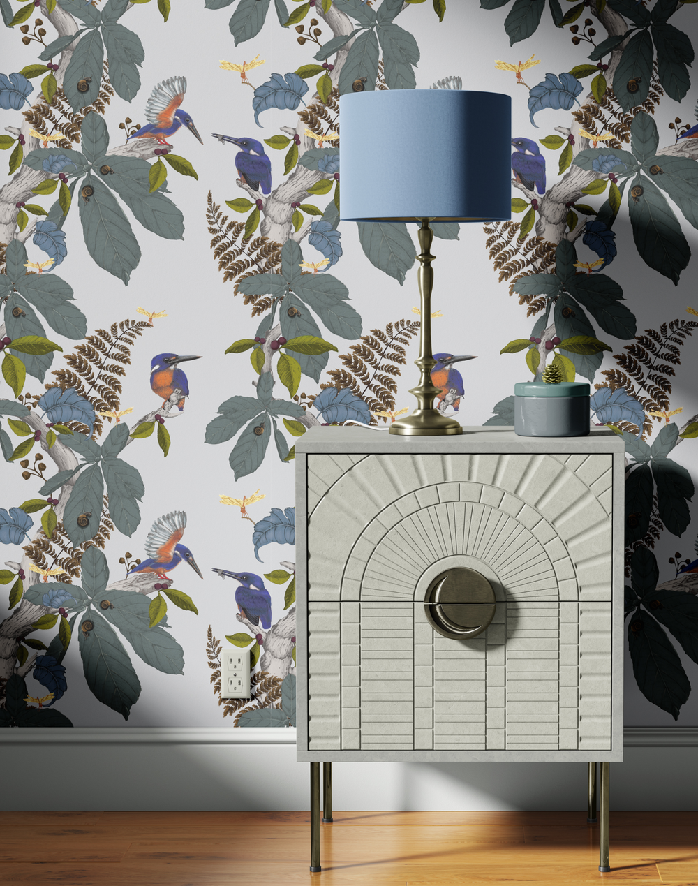 Our beautiful wallpaper is printed in Australia using our striking contemporary hand-drawn designs. The featured design is inspired by the Azure Kingfisher easily recognizable with a combination of brightly colored feathers, royal-blue plumage on its upperparts contrasting with orange on its underparts.