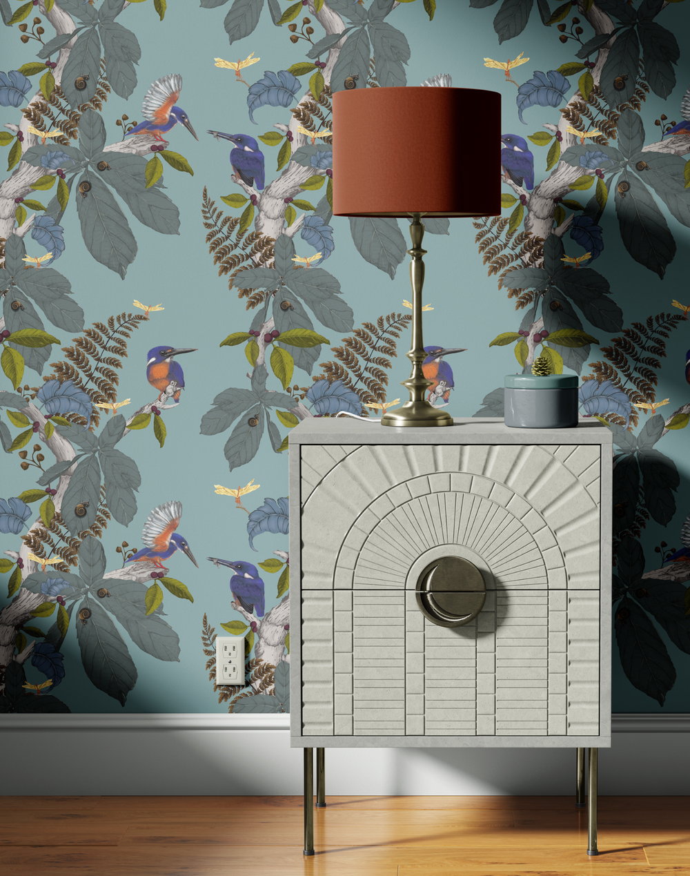 Our beautiful wallpaper is printed in Australia using our striking contemporary hand-drawn designs. The featured design is inspired by the Azure Kingfisher easily recognizable with a combination of brightly colored feathers, royal-blue plumage on its upperparts contrasting with orange on its underparts.