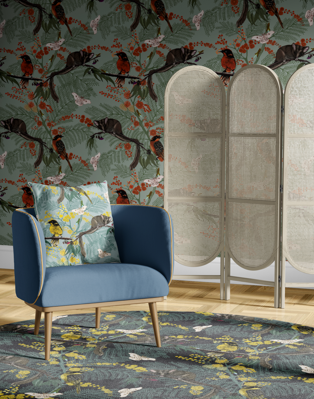 Our beautiful wallpaper is printed in Australia using our striking contemporary hand-drawn designs. The featured design is inspired by the Azure Kingfisher easily recognizable with a combination of brightly colored feathers, royal-blue plumage on its upperparts contrasting with orange on its underparts.