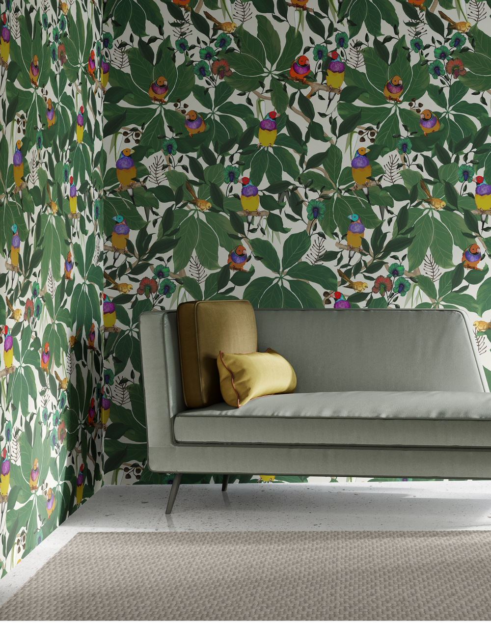 Our beautiful wallpaper is printed in Australia using our striking contemporary hand-drawn designs. The So Finchy wallpaper is one of my most popular designs and features the rainbow-colored Gouldian Finch and Silver Eyes sitting amongst the foliage.