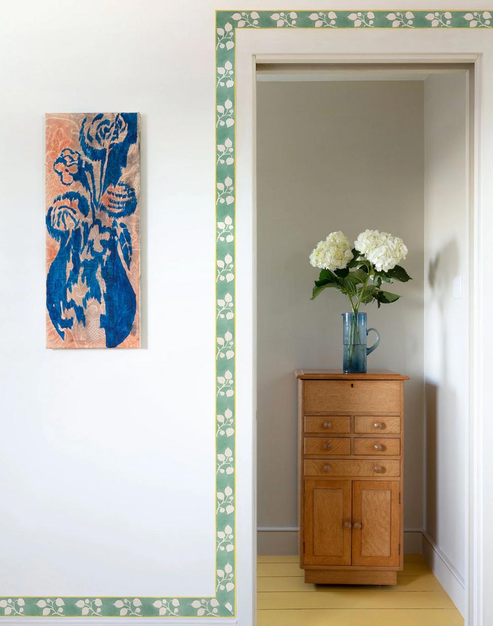This border is based on a 1918 design by Voysey for a striped woven silk. Silk has its origins in ancient China, where it was kept a precious secret until being smuggled out and revealed to the world as a luxurious commodity. Its opulence is thanks to its unique luster: when it catches the light, natural strands in the material are highlighted. We like to think of wallpaper borders as the highlights you find in paintings, where the lightest areas tend to be added towards the end to give a subject its shape and form. It’s the same with a room: a border has the potential to create real light and shade.