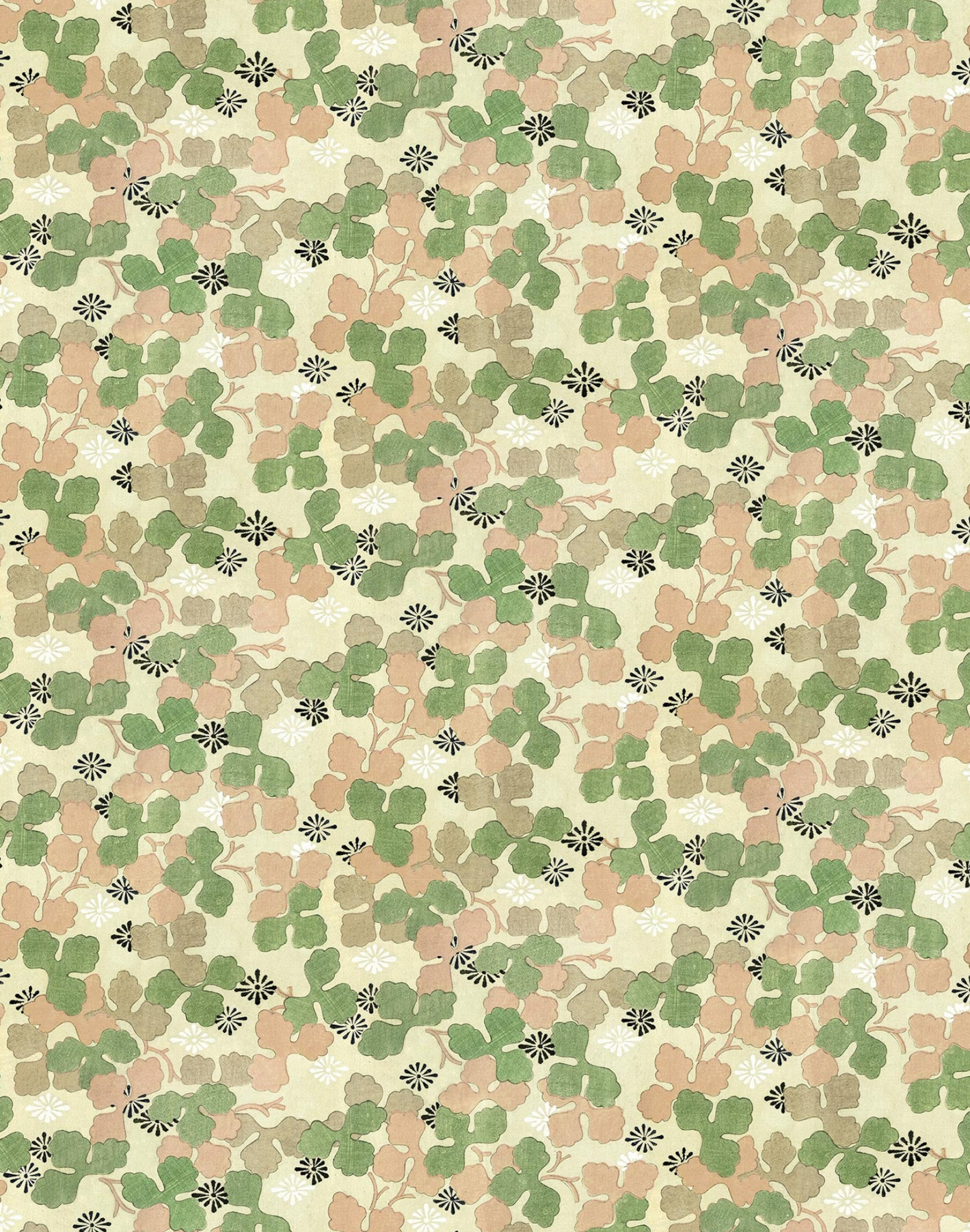 Originally a Shin-Bijutsukai woodblock print on paper, this canopy of creeping wood sorrel symbolizes resilience, persistence, and prosperity. A classic Meiji-era design element, Katabami is tougher than clover and a true survivor among plants. Growing in overlooked places like stone paths and the edges of rice fields, it thrives in adversity, its modesty masking its quiet strength.