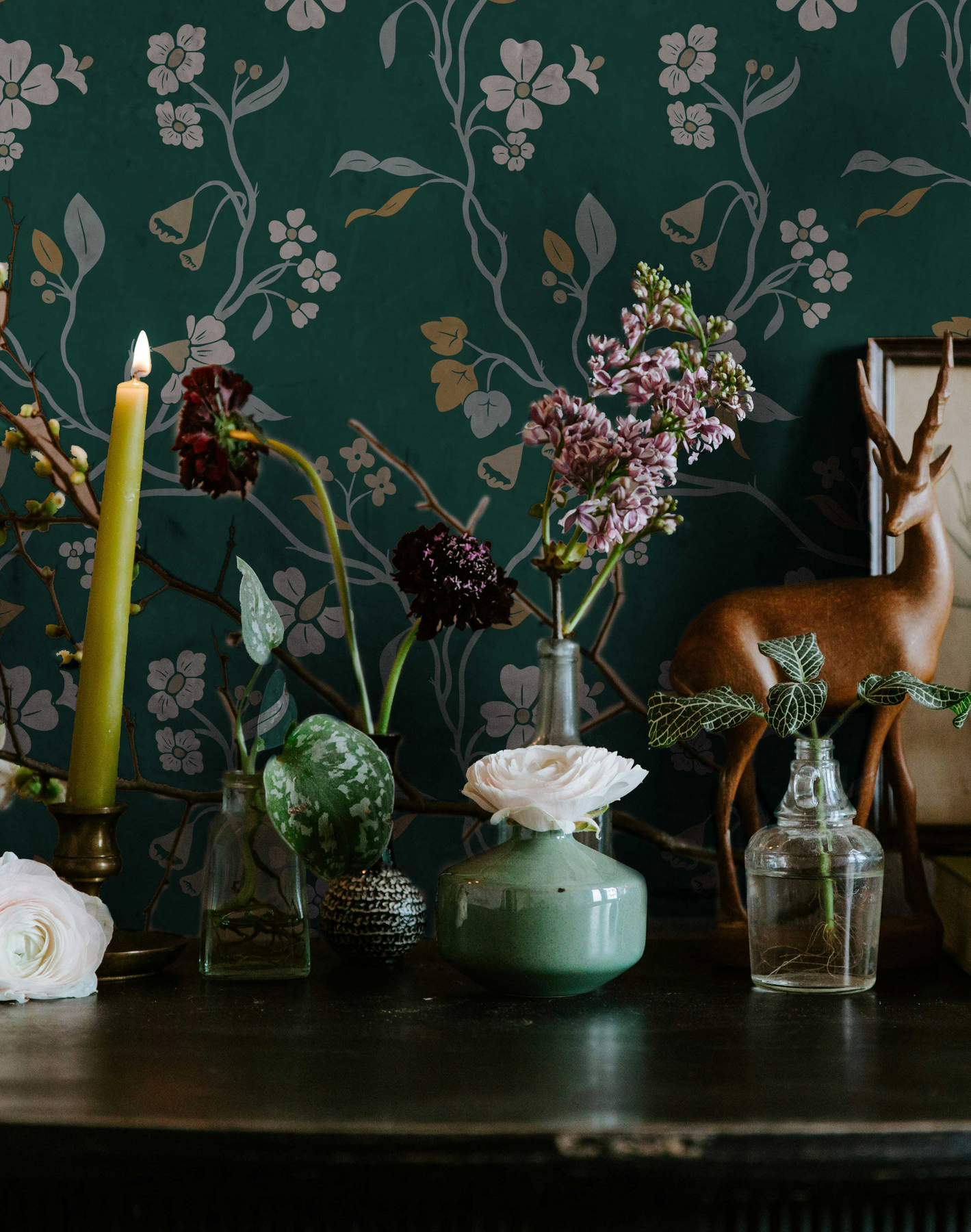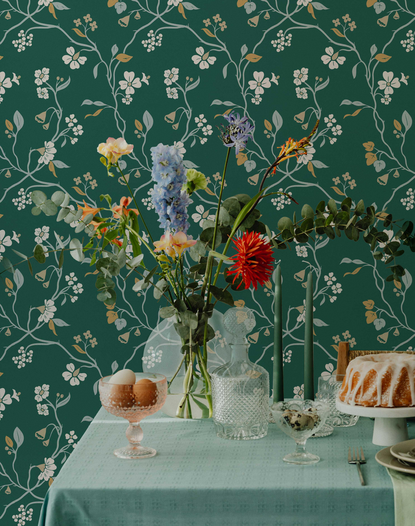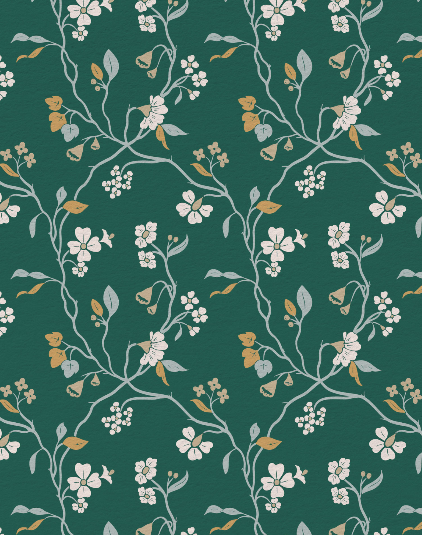 Lunaria Vine in Forest Glen embraces tradition with a fresh palette evoking the feeling of vintage design with a modern feel.
