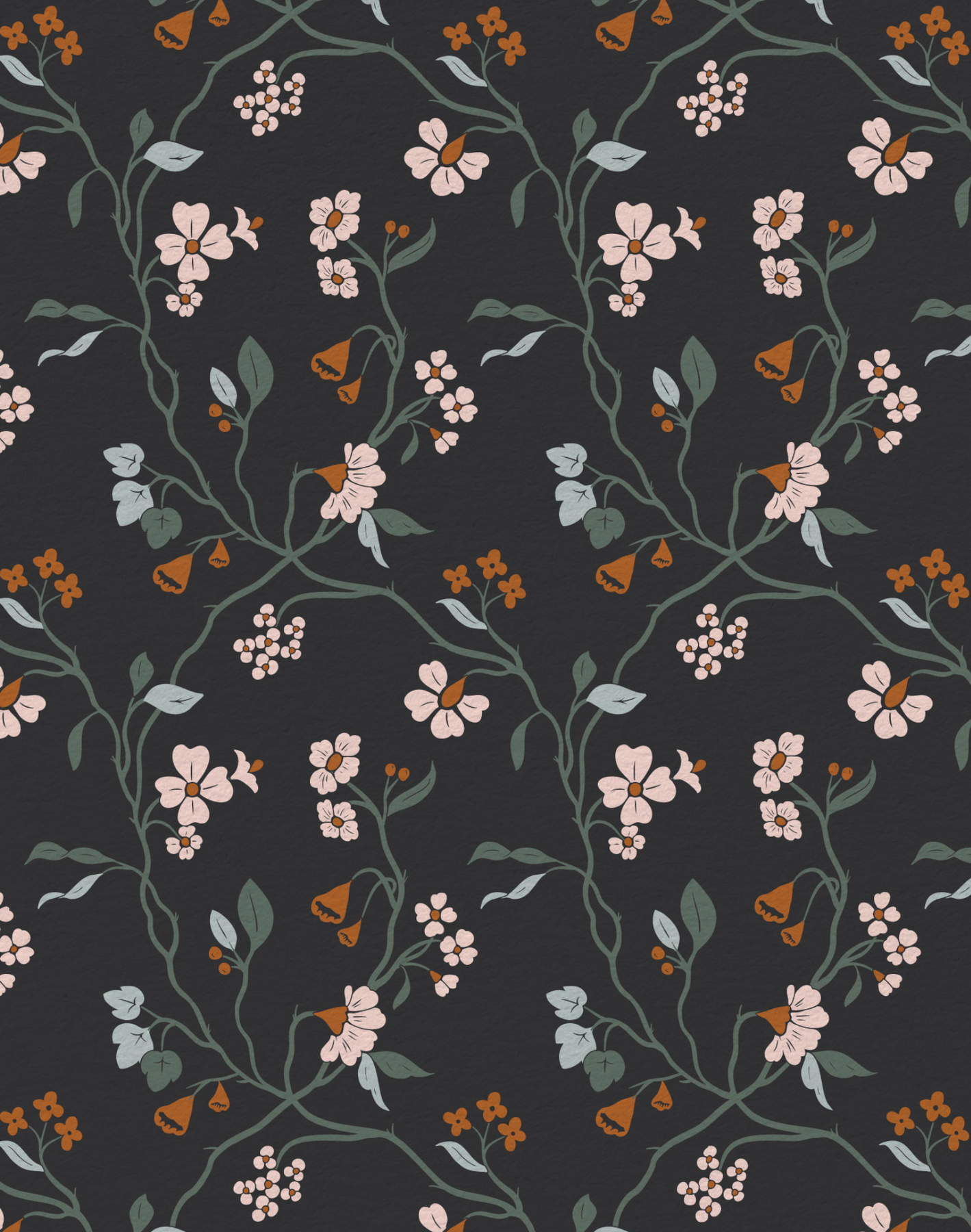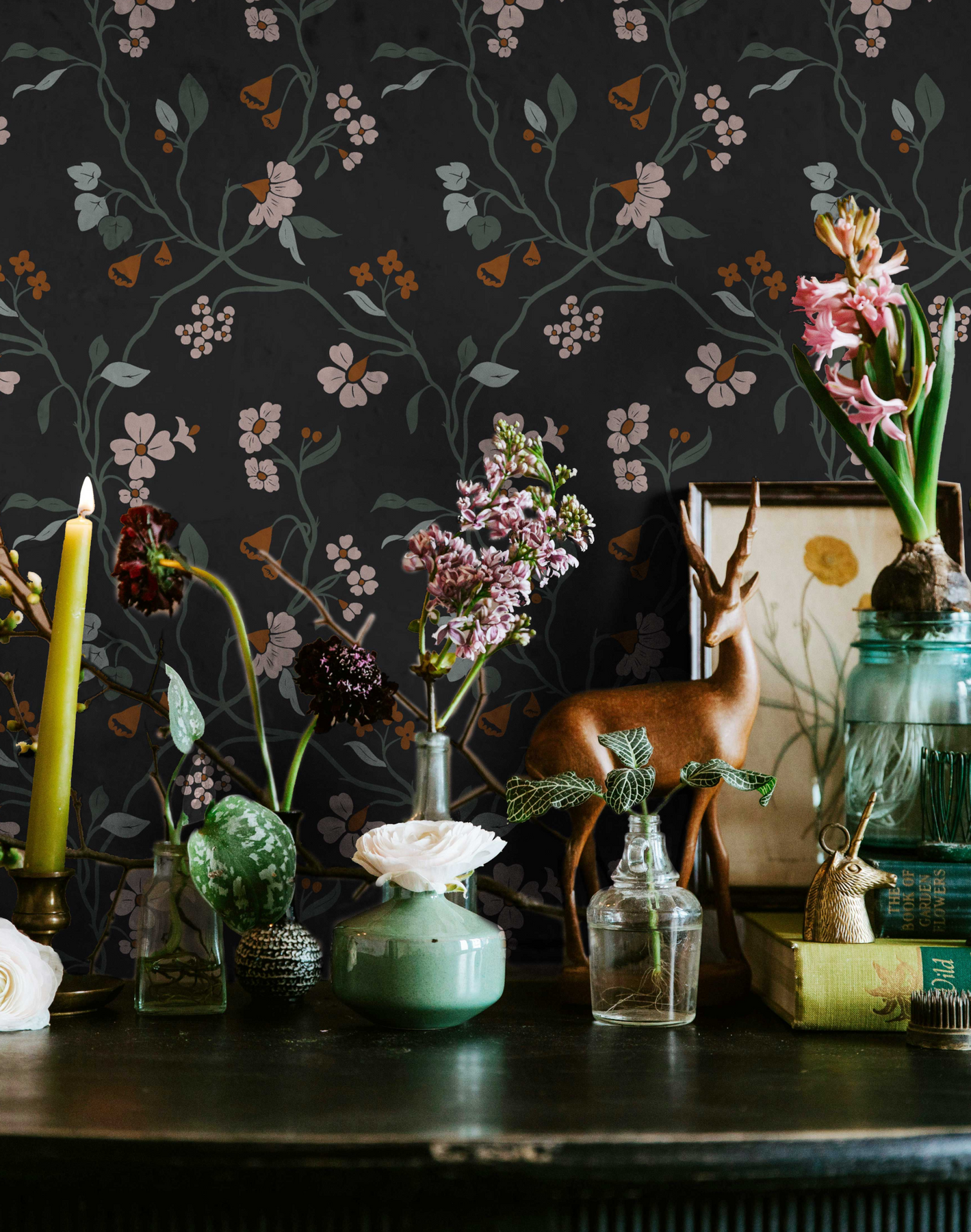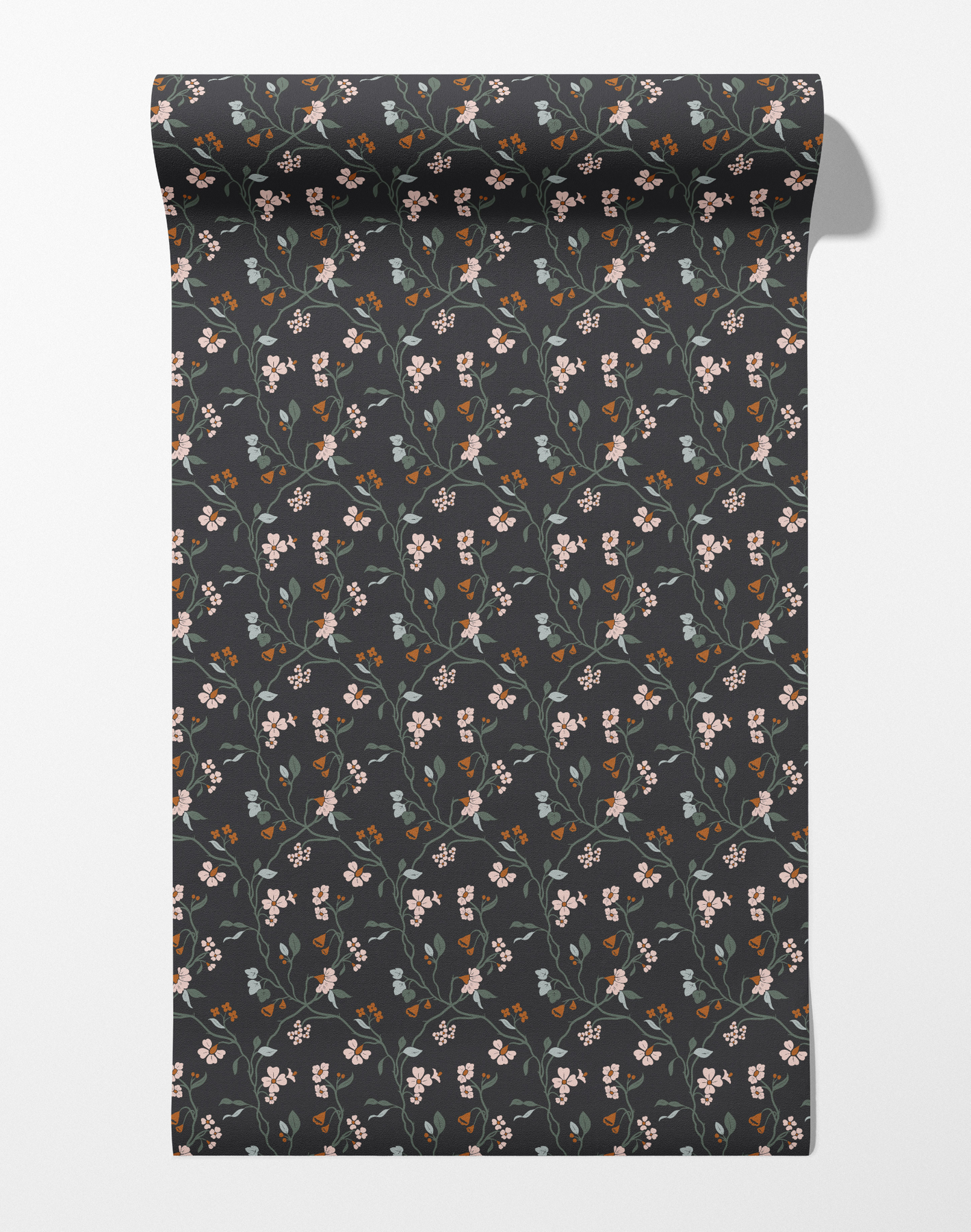 Lunaria Vine in Moody Charcoal combines soft florals against a bold charcoal backdrop adding contrast and sophistication to any interior.