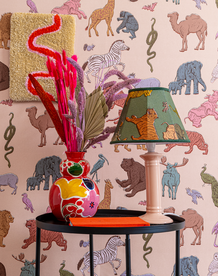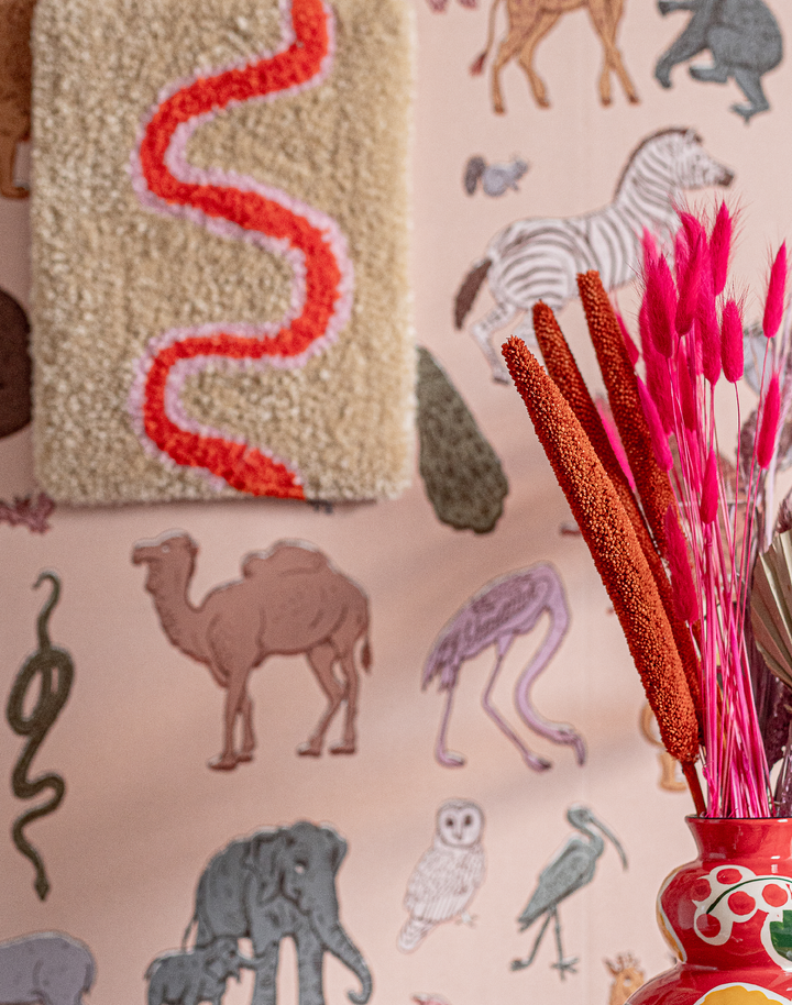 Assemble Wallpaper in Pastel-Pink. The assembly of our favorite wild beasts, all in one place. Assemble is a hand drawn line-drawing featuring an infamous ensemble of wildlife including bears, giraffes and flamingos! Digitally printed and willfully off set to give the hand-made crafted feeling of screen printed paper. This charming paper is so fun, playful and full of personality. Created in a palette of warm pastel shades to evoke softness. Brilliant for big kids as well as the little ones!!