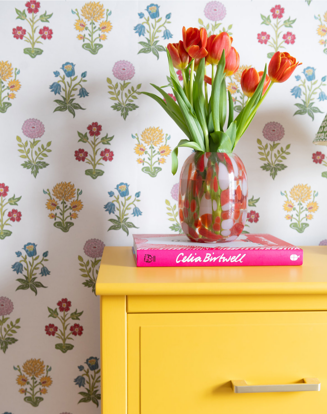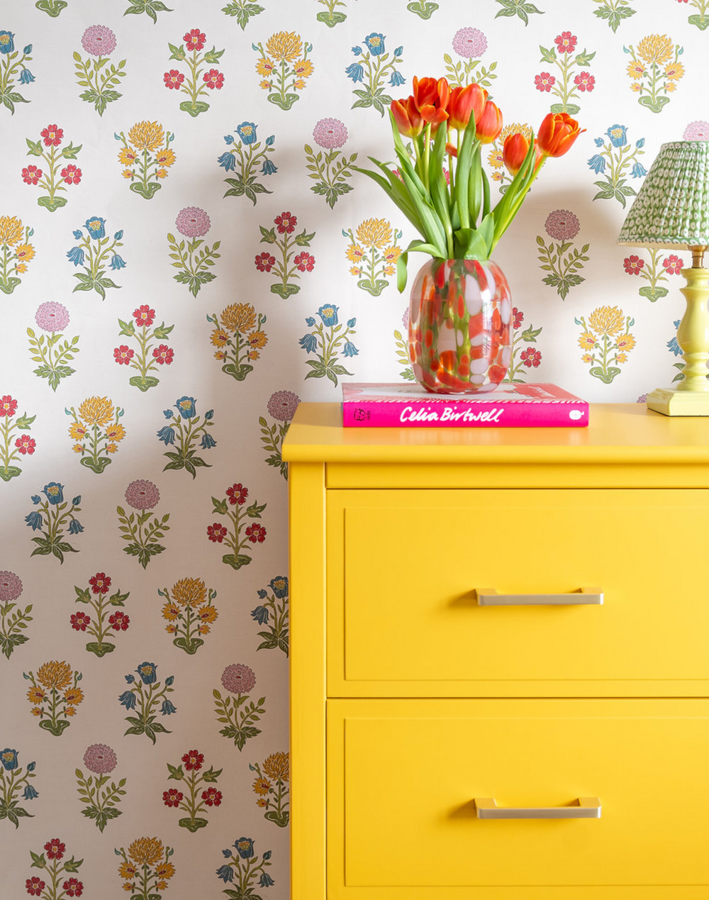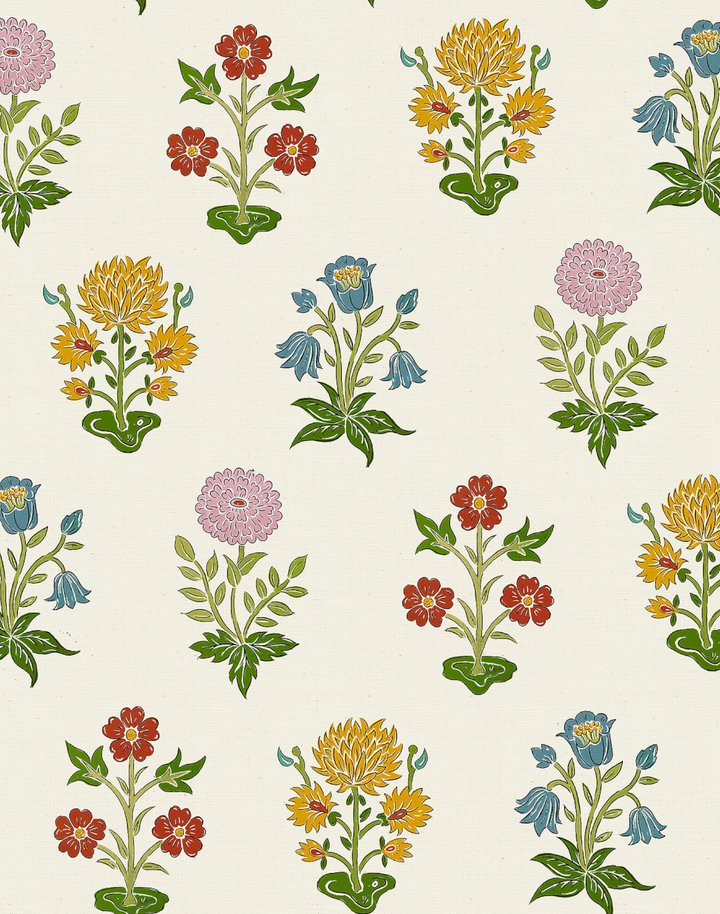 Our design Botany is a stunning floral print arranged in a rhythmic organic pattern and celebrates the ancient art of block printing. Inspired by a trip to Marrakesh the design features stylized springs of roses and dahlias delicately created using hand cut Lino stamps to replicate the textured charm of this beautiful technique. Coined 'Botany' after the scientific study of plants however in art and design, Botany often refers to the depiction of plant life symbolizing nature, growth and the beauty of the natural world. Our Citron colorway is a fresh and vibrant palette of primary colors infused with citrus shades of lemon and lime on a beautiful off-white background.