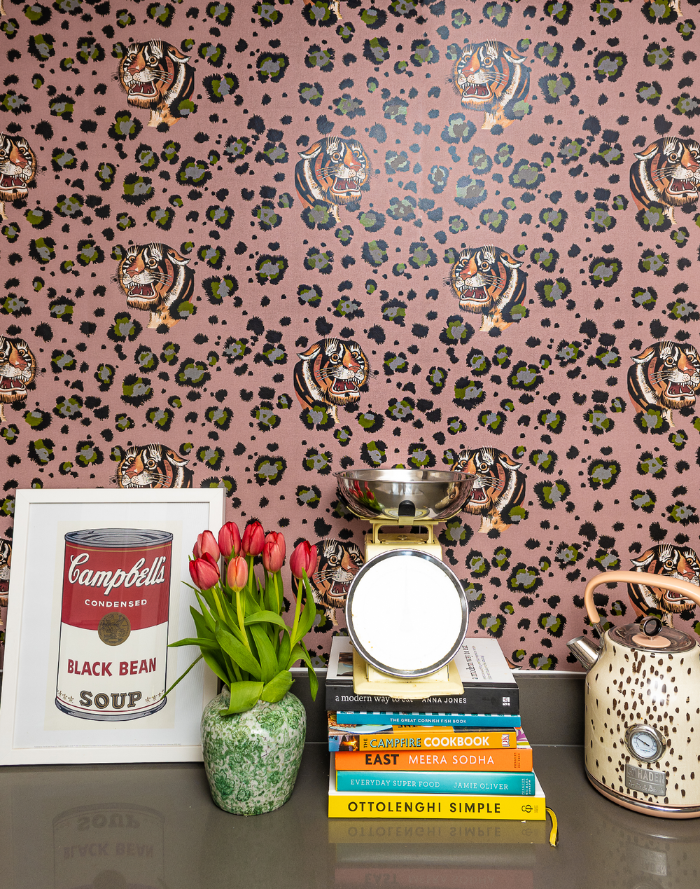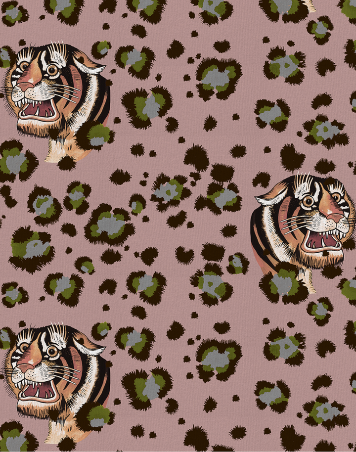 Bubastis Wallpaper in Blush-Pink. Named after the ancient Egyptian city of Bubastis, which was sacred to the Egyptian Cat Goddess, Bastet. Our design Bubastis promotes two big cats, the prominent tiger's head and the renowned leopard's printed spots, both hand painted in gauche paint. Egyptians (and us!) believe cats are magical creatures, capable of bringing good luck to the people who house them. Adorn your walls in Bubastis and feel that feline power! Bubastis is enhanced in a palette of blush pinks, dark chocolate browns and olive greens.