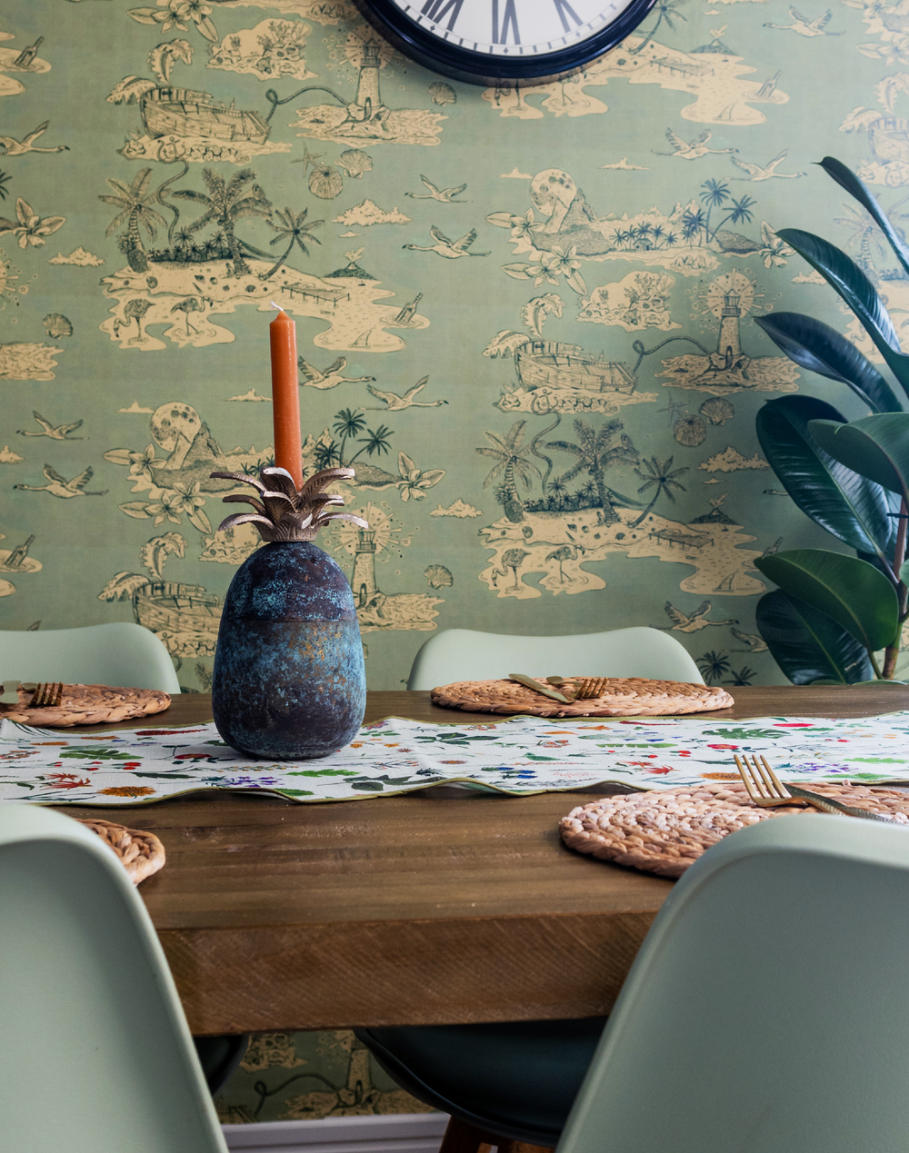 Castaway is our modern take on a traditional 'Toile de joy' style print. Featuring a 'lost in paradise' landscape which includes mountains, flying flamingos, palm trees, ship wrecks and a lighthouse. Castaway was designed with a back-to-nature island way of life in mind and was hand drawn using fine liners. We have added a texture to age the print and give it a more tactile feel. We wanted to create a paired back mono-tone design for an understated wallpaper effect in contrast to all our busy colorful designs! Castaway Sage features a serene soft green with a deep emerald-green outline.