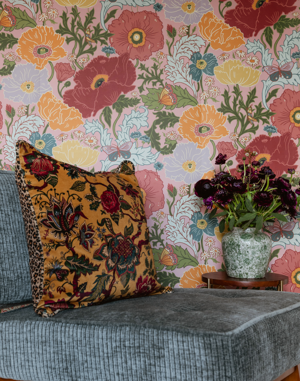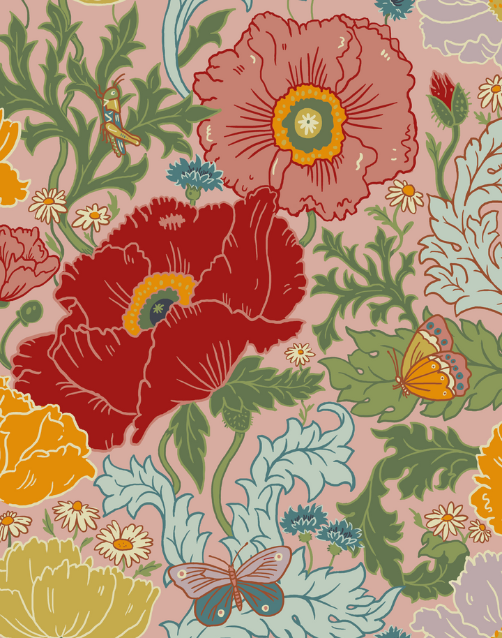 Fleur meaning ‘flower’ in the French language is a playful take on traditional Arts and Crafts style designs found in the Victorian era. This bold and beautiful poppy print champions these gorgeous spring time flowers, framed by cornflowers and tall field daisies. Inspired by the bright red poppy fields at West Pentire, Cornwall that bloom in early June every year for just a couple of weeks, before disappearing again for another year. We added in some fun little creatures to spot within the print. Our Blossom colorway is showcased on a traditional dusky pink ground and features a traditional multi color palette of greens, poppy reds and lilac.