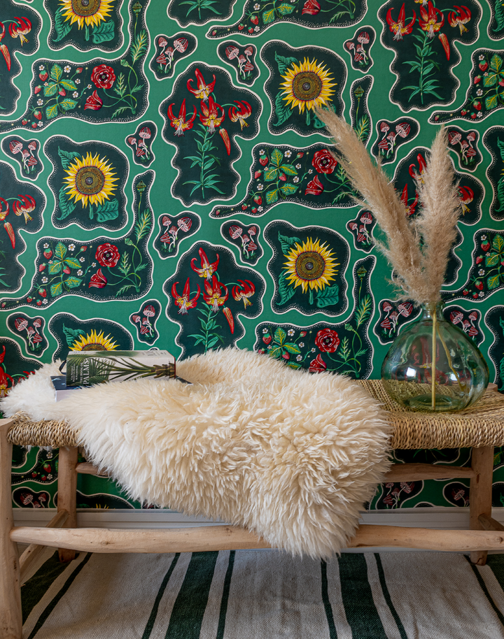 Halcyon is our homage to the carefree 70's, flower-power era! The word Halcyon construes to a period of time that was blissfully happy and peaceful. This stunning floral print will certainly transport you back there! Featuring bold sunflowers, strawberries, mushrooms and poppies in a playful psychedelic pattern and colored in a jewel inspired Emerald Green. Hand painted by us!