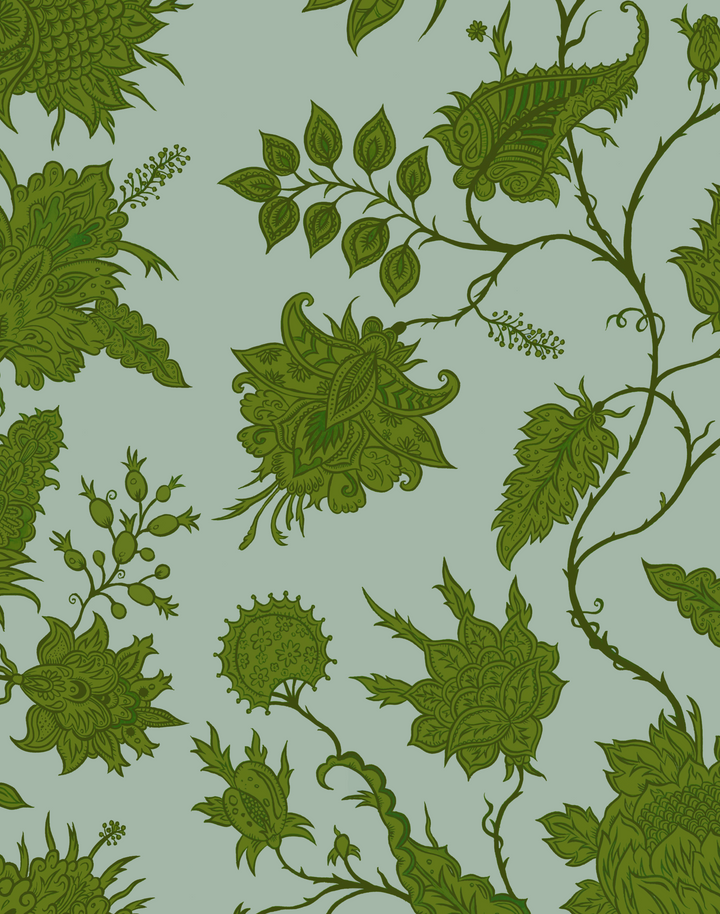 Hermosa Citrine/Zircon Wallpaper. Hermosa translates to 'beautiful' in Spanish and that, it truly is! Hermosa is a brand new take on our signature 'tree-of-life' prints. A two color classic. Inspired by Indian paisley style motifs combined with the magical floral and fruit emblems found on our inspiration trip to Costa Rica. The colorway Citrine/Zircon has so much energy and life in it. Fresh and Zingy and guaranteed to evoke joy and happiness. The Citrine yellow background promotes prosperity, happiness and wealth while the teal Zircon helps with relationships, harmony and self-confidence.