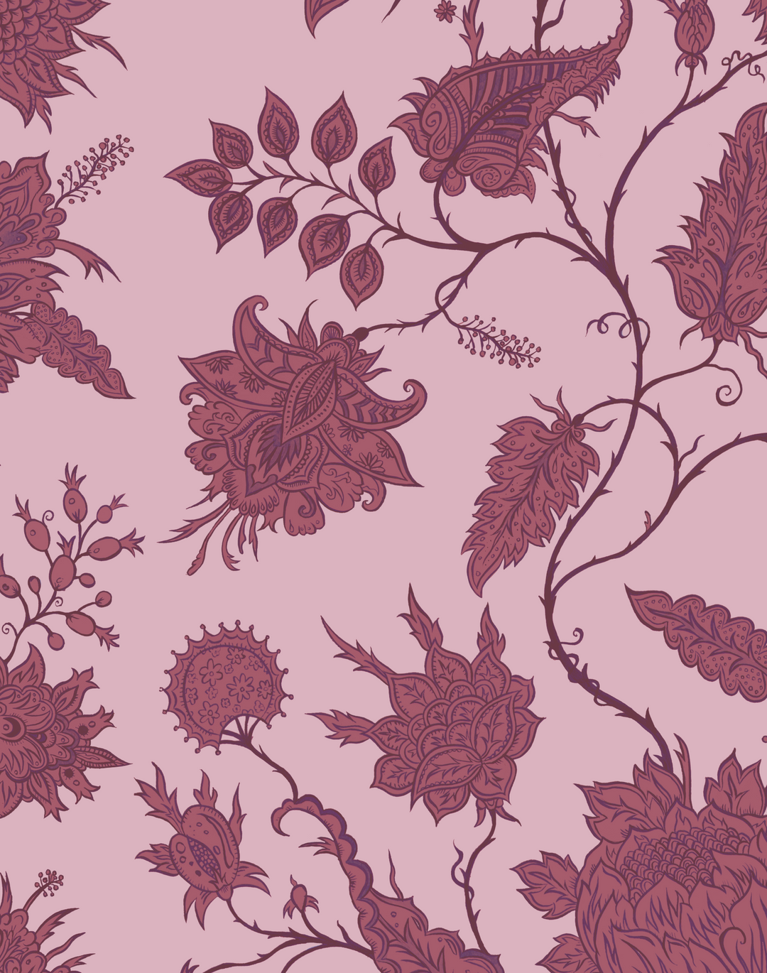 Hermosa Rose Quartz/Ruby Wallpaper. Hermosa translates to 'beautiful' in Spanish and that, it truly is! Hermosa is a brand new take on our signature 'tree-of-life' print. A two color classic. Inspired by Indian paisley style motifs but combining this with the floral and fruit emblems found in Costa Rica. The colorway Rose-Quartz and Ruby emotes a feminine quality that is beautifully sophisticated. Rose Quartz is said to promote Love, Passion and Calmness and the Ruby element promotes Mental Strength, Alertness and Confidence.