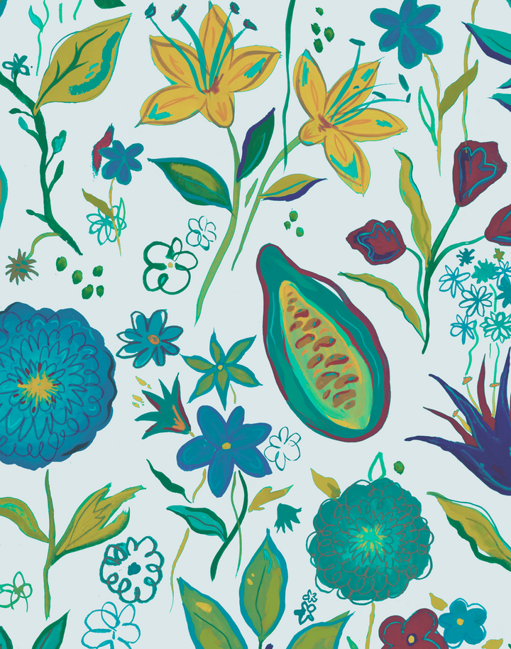 Kakao Acai-Blue Wallpaper. Our Kakao design was inspired by the origins of delectable chocolate! On our inspiration trip to Costa Rica we watched the process of chocolate making from start to finish which was truly fascinating and of course, delicious! Our print 'Kakao' features the famous fruit of the Theobroma cacao tree which are the pod like shapes within the design. The fruits harbor the cacao beans which are technically the seeds of the fruit. I wanted the style of the design to be childlike and naïve to reflect the joy and nostalgia that chocolate brings people. The Acai-Blue colorway (pronounced a-sai) is inspired by flavors paired with chocolate. The palette contains a beautiful array of burgundy’s, teals, ochre on a fresh sky blue.