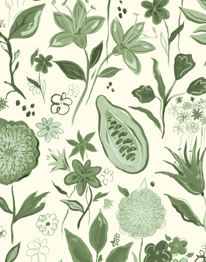 Kakao Matcha Wallpaper. Our Kakao design was inspired by the origins of delectable chocolate! On our inspiration trip to Costa Rica we watched the process of chocolate making from start to finish which was truly fascinating and of course, delicious. Our print Kakao features the famous fruit of the Theobroma cacao tree which are the pod like shapes within the design. The fruits harbor the cacao beans which are technically the seeds of the fruit. I wanted the style of the design to be childlike and naïve to reflect the joy and nostalgia that I believe chocolate brings to people. Our Matcha colorway is inspired by the green hue of the famed Green Tea powder, Matcha. Extremely popular in East Asia most notably in Japan. We named the Kakao colorways after flavors that pair well with chocolate and matcha is certainly one of them, especially when fused with white chocolate. The colorway features a beautiful array of muted sage greens on an off white/cream background.
